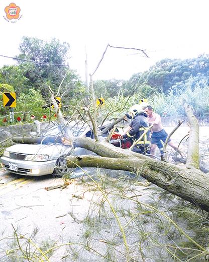 莫蘭蒂強風吹倒路樹壓傷駕駛!莫蘭蒂進逼金門,首先帶來強風,昨(14)日中午一名楊姓男子開車行經士校路,路邊一棵木麻黃突然被風吹倒,砸中該車引擎蓋及車頂,造成駕駛輕傷,送醫後因胸部挫傷,留院觀察。 莫蘭蒂颱風還沒到金門,風先到!強颱莫蘭蒂昨日掃過台灣本島南部後,朝金門步步進逼,雖然颱風還沒來,但昨日上午金門地區已經可以感受到明顯強風,根據氣象局觀測資料,金門昨日出現9級陣風(風速約每秒24公尺),開車在路上都可感受車子被風吹到搖晃。 昨日中午約12:30左右,一名41歲楊姓男子,駕駛銀色自小客車,由下莊沿士校路往幹訓班方向開,行經轉彎處,左側突然一棵木麻黃大樹被風吹倒,不偏不倚砸中該車引擎蓋,車子引擎蓋和部分車頂嚴重凹陷,車窗也幾乎全碎,怵目驚心。不幸中大幸,該樹沒有砸到駕駛座,不影響該楊姓駕駛脫困,金湖消防隊獲報抵達時,楊姓駕駛已自行脫困,據消防隊表示,楊姓駕駛沒有明顯外傷,但他表示頭胸會痛,因此送醫檢查。據了解,該男到醫院照完X光,沒有骨折,不過因胸部挫傷,留置急診觀察中。 這棵倒下的木麻黃,橫躺在士校路上,阻礙兩對向交通,金湖消防隊立即將樹鋸斷,清除路上障礙,恢復通車。而被砸的車子,經到場金湖鎮長蔡西湖協調,也委請拖吊業者拖離維修。縣府也立即指派兼林務所長葉媚媚趕到醫院慰問傷者,並表示林務所可幫忙該車維修費用。 另外,昨日也有一名60多歲的婦人(林務所員工)騎車時,被路樹倒下壓傷,不過其自行就醫,照完X光亦無骨折,僅擦傷,隨後自行離院返家。 莫蘭蒂颱風來勢洶洶,沒有經過台灣中央山脈削減威力,直撲金門而來,甚至有預測颱風中心會登陸金門,提醒民眾務必小心,非必要盡量不要出門。