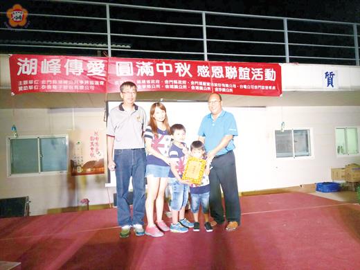 為歡慶中秋佳節,金寧鄉湖峰公共事務協進會日昨假金門大橋工務園區舉行「湖峰傳愛、圓滿中秋」節慶文化親子教育暨感恩聯誼活動,會長楊家聲特別贈牌感謝協助該協會淨灘認養活動,縣籍立委楊鎮浯、金寧鄉民代表會主席陳成泉到場賀節並與民眾聯歡同樂,度過不一樣的中秋佳節。 金寧鄉湖峰公共事務協進會為發揚關懷弱勢團體,扶弱濟困、人溺己溺的精神,結合福建省政府、金門縣政府、金酒公司、台電公司、金寧鄉公所、金城鎮公所、金湖鎮公所 金沙鎮公所 金寧鄉民代表會及泰偉電子股份有限公司,假金門大橋工務園區舉行「湖峰傳愛、圓滿中秋」節慶文化親子教育暨感恩聯誼活動。 湖峰公共事務協進會藉由此活動除了讓民眾瞭解節慶由來,為表達對消防、義消兄弟敬意,今年在金寧地區舉行特邀請金寧消防隊、金寧義消分隊弟兄聯歡共度佳節,感謝消防弟兄平日為守護人民生命財產的付出與辛勞,讓活動呈現感恩的氣氛。湖峰公共事務協進會從創會主席楊萬山開始就議訂以瞭解本地民眾需求,凝聚社區共識,推動公益活動,敦睦鄉親情誼為宗旨,只要該協會有辦活動會員們幾乎是全家出動共襄盛舉,一起瞭解社區外也可培養親子間感情。 該協會總幹事由楊會長延聘金門大學食品科學系賴盈璋老師出任,協助推動會務。楊會長說,本會總幹事長期致力協助地區食品產業昇級,從推廣在地醬油製作、研發高粱酒糟成為生物炭材及黑蒜頭功能性的研究等有卓越的成果,本會借重在學術界管理的經驗及豐沛的研發能量,吸引更多年輕學子認同本會及有機會借重長才為金門舉才。當日盛會有金門大學應用外語系、觀光系、食品科學系動員數十名學生志工現場服務,活動中會長楊家聲特別頒贈感謝牌感謝金城國中李學郁、金寧中小學呂子恩、呂沅特、金湖國小陳韋伶協助該協會淨灘認養活動,讓環保意識教育深化、讓公益活動得以傳承,會長楊家聲特別表示希望更多的學生共同支持此項公益服務,讓此活動得以永續推動,為環境善盡地球公民責任。