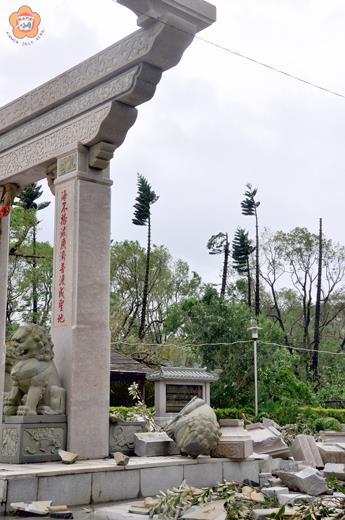 圖文/翁維智 風力破表,肆虐金門的莫蘭蒂颱風昨晨颳起17級強風,這個風力足以帶來毀滅性破壞的「怪獸」,連坐鎮石雕公園天后宮的媽祖娘娘也禁受不起,尤其廟郢前的石牌坊,上半部昨晚轟然倒地,雖然不是連根拔起,但只看柱旁的石獅都投降和廟郢一片狼藉的慘狀,不難想見這個颱風的威力!