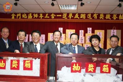 金門地檢署反賄選宣導活動之一的法律常識有獎徵答,昨日由金門地檢署檢察長劉家芳等人共同公開抽獎,在一萬三千四百二十二件參與的明信片中抽出一百二十五位幸運得獎者。檢察長劉家芳指出,此次宣導活動獲得社會大眾踴躍參與,使「反賄選,斷黑金」以及「讓買票者當選,是老鼠咬破布袋」的觀念深植人心,並呼籲民眾拒絕賣票,淨化選風,期待大家營造乾淨的選舉風氣,選賢與能,共同來洗刷「賄選島」之惡名。 金門地檢署配合九十四年縣長、縣議員和鄉鎮長「三合一」選舉,實施反賄選宣導,其中,法律常識有獎徵答活動於10月1日起在本報及該署網站公布題目及抽獎辦法後,獲得熱烈回響,參加徵答收件計有民眾8,053件,各級學校師生5,369件,總計13,422件,反應熱烈。 昨日上午十時在金門地檢署五樓會議室舉行的有獎徵答抽獎活動,由檢察長劉家芳主持,包括福建省政府主席兼省選舉委員會主任委員顏忠誠、金門高分檢署檢察長林玲玉、金門高分院院長蔡清遊、金門地方法院院長康樹正、福建省調查處處長沈綏安等參加,抽出一百二十五位幸運兒,並一致宣示反賄選。 省選舉委員會主委顏忠誠表示,這次「三合一」選舉,反賄選宣導活動是歷年來辦得最好,深入學校和家庭,在縣議員選舉「賄聲賄影」中,對有意從事賄選不法的人有所警惕,期待大家踴躍參加十二月三日的選舉投票,選賢與能。 檢察長劉家芳首先感謝各機關團體熱誠贊助獎品,使獎項由61獎增加至125獎,讓宣導活動增色不少。對於反賄選宣導獲得各界踴躍參與,使「反賄選、斷黑金」以及「讓買票者當選,是養老鼠咬破布袋」的觀念深植人心,表示欣慰,他並期待大家共同營造乾淨的選舉風氣,選賢與能,共同洗刷「賄選島」惡名。 (相關得獎名單詳刊第二版)