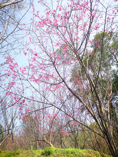 春寒料峭,位於金門東北角的制高點天摩山,最近櫻花開了!登山道旁的櫻花林點綴著繽紛的紅色,讓人感受到春天的生機勃勃。 從閉著門的衛哨亭一路向山頂走去,山道旁有著成片的櫻花樹,在寒意猶存的現在,枝頭開出了不少的櫻花。蜜蜂穿梭在枝頭的櫻花與路旁的咸豐草間,讓目光追隨著牠們的人,也感受到了春天的喜悅。 天摩山,舊名煙墩山,位於金沙鎮青嶼,海拔約六十三公尺。明時設有烽火台,點燃煙火以作為對海盜倭寇來襲時的警示;先前作為國軍的觀測所,撤軍後交由海巡署金門海岸巡防總隊接管,山頂設有雷達站。山頂視野開闊,附近海岸美景盡收眼底,可見山下的馬山觀測站、后嶼,天氣好的日子,連對岸的大嶝、廈門市翔安區也清晰可見。 遊客可順著青嶼村外沙青路連接的戰備道一路到天摩山,或是從官澳風獅爺(雄)旁的小路上山。