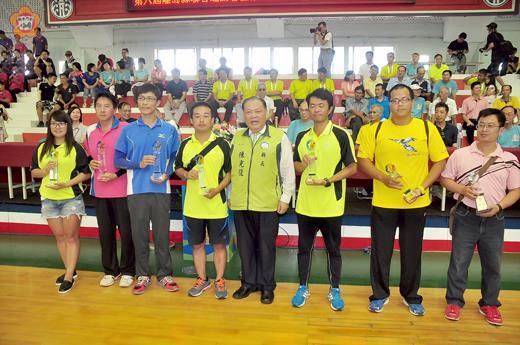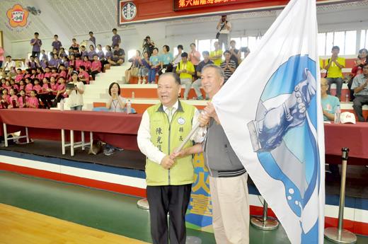 圖文/陳冠霖 9日至11日舉辦的第6屆離島運動會,昨(11)日下午順利在澎湖縣立體育館舉行閉幕典禮,為期3天的離島運動會暨澎湖縣運,共計有62多隊參賽,隊職員及選手超過3000人參加,十分盛大;本屆離島運動會,金門代表隊總計抱回27金24銀14銅。 澎湖縣長陳光復表示,歡迎金門和馬祖的鄉親常常到澎湖來玩;閉幕典禮最後,也由金門縣政府參議許寬代表金門縣長陳福海,從澎湖縣長陳光復手中接下離島運動會會旗,許寬並當場揮舞大會會旗,象徵2年後(107年)將輪到金門主辦離島運動會,許寬代表陳縣長誠摯邀請大家到金門來玩,相約希望到時候能在金門相聚!