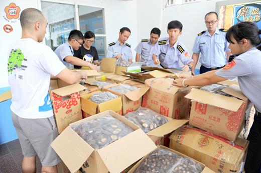 大陸貨品轉運、破壞秋節行情!金門岸巡隊因應秋節將屆進行安康專案,今年七月起強化港區貨物安檢工作,期間查獲多起大陸農產品及免稅菸品違法寄運返台,總計查獲四百多公斤的大陸香菇以及各種零嘴點心,岸巡隊特別呼籲民眾,大陸食品未經食品檢驗與防檢疫不得輸台,不但品質沒保障,更可能危及民眾身體健康。 金門岸巡總隊副總隊長吳建冠表示,因應秋節將屆,國內農漁畜產品需求增加,海巡署執行安康專案,全力查緝走私之農漁畜產品、動物活體、菸、酒等,同時避免不肖業者伺機將大陸劣質農產輸台牟利,以維護農、漁民權益及國人身體健康,金門岸巡隊自七月起,於料羅港區船舶進出尖峰時段,派駐支援人力,加強執行港區貨物安檢勤務,對於運往台灣貨物檢查提升檢查標準。期間合計查獲大陸農產品410.57公斤,其中包括大陸香菇、大陸花生、大陸蜜棗等產品,另外還有免稅菸品66條(660包)。 岸巡隊查獲私貨後已聯絡貨主,並將全案均依違反「試辦金門馬祖澎湖與大陸地區通航實施辦法第26條」、「菸酒品管理條例第46條」函送主管機關裁處。 金門岸巡隊特別呼籲,依「試辦金門馬祖澎湖與大陸地區通航實施辦法第25條」,金門、馬祖或澎湖與大陸地區運輸工具之往來及貨物輸出入、攜帶或寄送,以進出口論;前項進口物品未經許可,不得轉運金門、馬祖或澎湖以外之臺灣地區。違者,依海關緝私條例第36條至第39條規定處罰。提醒地區民眾,大陸農產品不得以郵包方式寄運台灣,以免誤觸法律。 岸巡隊強調,為維護國人健康及生命財產安全,民眾若發現不法情事,請多利用海巡署「118」免費服務專線,海巡單位對於查緝不法活動皆不收取任何費用及餽贈。