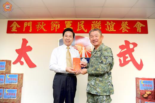 一○五年秋節軍民聯歡餐會昨日假金防部鑑潭山莊盛大登場,指揮官郝以知率領金防部軍士官兵們與地區首長會餐,縣長陳福海、副議長謝東龍也送上秋節加菜金等禮品,感謝軍方多年來對金門的貢獻,雙方並在會中釋出加強漢光演習與觀光旅遊合作模式、第二士校改制為全國新兵訓練中心的好消息! 這場聯誼餐會是在昨天晚間六時整於金防部鑑潭山莊舉行,由指揮官郝以知親自主持,縣長陳福海也率領縣府一級主管參加,另外副議長謝東龍以及各鄉鎮首長也應邀與會,現場氣氛熱烈非凡。 會中,金防部指揮官郝以知特別感謝縣屬各單位蒞臨參與秋節勞軍餐會。他表示,蔡英文總統日前來金勞軍,看見漢光演習成效卓著,釋出明年度可考慮開放演習參觀人數,讓民眾見證國軍的戰力之外,為國軍加油打氣,也能運用金門特有的戰地特色進行國防觀光,見證百戰英雄島的美名。 郝以知表示,未來金門軍方與金門各主管機關有相當多的合作機會,不論是急難救災、勤務支援,將與地方單位密切配合,落實軍民一家的理念。也希望透過訓練來強化戰力、提昇士氣,重拾軍人的尊嚴與榮耀。 至於縣長陳福海則感謝軍方協助各項救災工作,他並表示,趁著總統蔡英文來訪之際,他特別提出多項政策建議,其中包括將現有的第二士校改制為全國的新兵訓練中心,如此一來不但能有效利用廢弛營區,在離島參訓的士兵也一定會更有戰力與愛國意志。他也憶起民國八十八年時,國軍協助金門丹恩颱風救災的景況,肯定駐軍與金門民眾是「軍民一家、同島一命」,希望未來軍民能共存共榮。 而副議長謝東龍也對軍方協助防務表達謝意,感謝所有國軍弟兄們保家衛國,他希望藉由聯誼活動展現軍愛民、民敬軍的精神。 聯誼餐會致詞後,縣長陳福海及副議長謝東龍也代表金門各界致贈秋節加菜金及高粱酒等禮品予軍方,並由郝以知代表接受,而昨日的聯誼餐會由金防部作東,地區各單位首長、政要熱情與會、提前歡度中秋佳節。