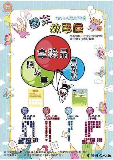 文化局自四月起推動週末故事屋活動,吸引親子到場聽故事,活動持續展開,為引領孩童進入閱讀領域文化局設計「愛聽故事」集點卡,鼓勵學童聽故事集點兌獎,共計有二十六位學子集滿十點領到精美獎品。而週末故事屋九月十日由李淑芬主講「蠟筆小黑」等故事,歡迎親子到場參與。 文化局週末故事屋活動深受親子喜歡,四月推出延續迄今深受好評,伴隨「愛聽故事」集點卡活動導引,也帶領學童自金門各地到場參與,不少東半島的家長也加入說故事行列,讓故事達人陣容愈來愈堅強。週末故事屋九月十七日配合「糖果屋」兒童劇演出暫停一次,九月十日將由李淑芬主講,而九月二十四日將由中正國小老師李卓恩、及多位學生助手到場分享,更是喜歡聽故事的你不可錯過的難得機會。 週末故事屋於每週六下午二時登場,當日上午「兒童美語故事」時間暑期暫停,即將於十月一日起恢復,時間是上午十時至十一時,也歡迎親子一同參與,洽詢電話328638轉501。