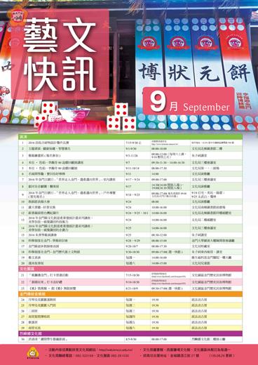 文化局九月藝文活動,2016年金門古蹟日│「世界走入金門、遺產邁向世界」九月十七日起登場,本位‧色焰│李錫奇80返鄉回顧展九月十一日起,露天書牆│好書交換將於九月二十四日舉辦。另外,2016朱熹學術演講會、科舉制度在金門-學術研討會亦將於九月底登場。 文化局九月藝文活動,2016浯島吉祥物設計徵件比賽,刻正收件中,九月三十日止( http://www.kinmen-mascot.tw/)。首次對成人藝術繪畫班開跑,採報名參加(9/10暫停乙次)。「健康保健,智慧養生」主題書展於文化局北棟圖書館二樓展出,另外,本位‧色焰│李錫奇80返鄉回顧展講座及返鄉回顧展,分別於九月七日及九月十一日展開,其他藝文活動如后: 9/11名城開學趣:寶貝你好棒棒,14:00文化局演藝廳。9/17銀河谷音劇團:糖果屋14:30、19:00(兩出前半小時開放入場)。2016年金門古蹟日-「世界走入金門、遺產邁向世界」-室內講座及戶外導覽,訂於9/17、9/18、9/24、9/25。9/24教師節表揚大會,文化局演藝廳。9/24露天書牆-好書交換,10:00-16:00,文化局南棟圖書館前廣場。跟著鏡頭看台灣紀錄片,9/24、9/25、10/1,14:00-16:00,文化局北棟圖書館四樓視聽室。 2016年金門縣文化創意產業發展計畫系列講座:美學加值—視覺識別的技術力、視覺識別的企劃力,9/24、9/25、14:00-16:00。2016朱熹學術演講會,9/25,08:30-12:00朱子祠講堂。科舉制度在金門-學術研討會,9/28、9/29,08:00-15:00,金門大學圖資大樓陳開蓉會議廳。金門縣退休教師會員展,9/28-10/7,文化局特藏室。科舉制度在金門-金門歷代進士文物展,9/30-10/30,朱子祠東西廂房、講堂。 「風獅護金門」打卡票選活動,7/15-10/30,詳情請至粉絲頁(https:www.facebook.com/kmcpao103)。「慕閩而來」打卡送好禮,9/10-10/30詳情請至粉絲頁(https:www.facebook.com/kmcpao103)。《風》情萬種‧創《藝》無限展覽,8/21-10/9,文化園區金門歷民俗博物館。金門傳統音樂館,每日晚間七時三十分起,週一至週六排定為,月琴烏克麗麗進階班、月琴烏克麗麗入門班、二胡班、南管琵琶彈唱班、歌謠班、南管交流。烈嶼鄉文化館,8/5-9/30洪清漳「潮間帶生態攝影展」。