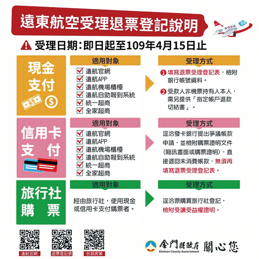 遠航去年12月無預警停飛後,同年12月13日起開始受理退票登記,歷經近兩個月折衝,民航局日前發布遠東航空公司消費者信託專戶公告表示,受委託律師10日公告信託財產專戶即日起受理旅客登記,受理期間至4月15日止。 為協助本縣消費者爭取自身權益,金門縣政府也轉貼相關公告指出,遠航前依交通部民航局要求遠航設立信託財產專戶,將由該專戶支應旅客退票款項。遠航所委託之杜孟真律師業依據與遠航簽訂之金錢信託契約書規定,公告剩餘信託財產金額、相關受益人之申報事宜及擬分配原則。 民航局表示,目前信託專戶內有現金1億6389餘萬元,待受理登記截止後,律師會根據已受理之消費者退票金額,如帳戶現金足以支應,將全額退費,如不足支應,將由律師擬定分配原則。民航局也說明,已付款購買遠航機票,已開票但未獲得運送服務的消費者、旅行社等售票單位及聯合信用卡中心均可登記。相關受理登記管道包括:遠航官網:https://www.fat.com.tw/。客服電話:4499-567(手機請加02)。傳真:(02)2545-5150。客服信箱:service@fat.com.tw。服務時間:週一至週五:08:00-17:00。 另現金支付、信用卡支付、旅行社購票退票辦法請見附圖。退費各類文件下載:https://www.fat.com.tw/download-file。