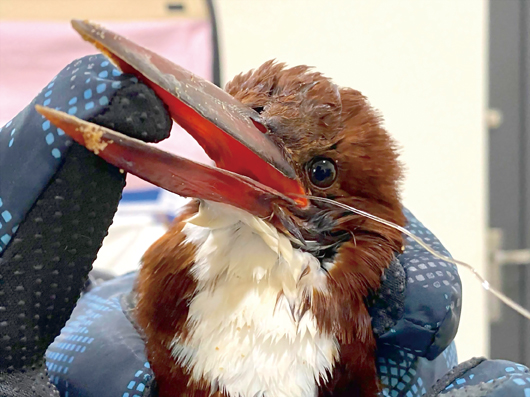 翡翠中鉤、獸醫搶救!一隻蒼翡翠日前疑似誤吞魚鉤和魚線釣組,被路過太湖地區運動的民眾發現後報請金門縣野生動物救援暨保育協會搶救,經獸醫歐陽夢澍開刀診治取出釣鉤,並進行傷後復原與進食訓練,順利野放、重返大自然。 有「飛行的藍寶石」美稱的蒼翡翠是金門地區珍稀的留鳥,許多兩岸鳥友到訪金門就是為一賭這種鳥兒美麗的風采和一身靛藍華麗的背羽。一位熱心民眾日前路經金門太湖地區時,意外發現一隻蒼翡翠疑似誤吞魚鉤釣組在湖畔載浮載沉,急忙通報金門縣野生動物救援暨保育協會到場搶救。 經協會人員到場救回這隻「上鉤」的翡翠後,獸醫歐陽夢澍急忙以氣體麻醉進行手術,從細小的蒼翡翠食道中取出長約二公分的魚鉤。這隻獲救的翡翠並暫時安置在協會進行傷後復原與進食訓練,在協會人員細心照顧、休養幾天之後,蒼翡翠恢復狀況良好,並在昨日順利野放,重回大自然的懷抱。 蒼翡翠身長約27公分,中型翡翠,頭、頸、腹下暗栗褐色;喉、胸白色;背羽青藍色,嘴紅色、厚而尖,腳為暗紅色。平時獨棲性,於平地的溪流、魚塭、湖泊等地活動,以魚、蛙、蝦、蟹與昆蟲為食,常棲坐在水域旁的枝頭上,伺機捕魚。蒼翡翠披著一身蒼翠的羽色與大嘴可愛的身型,是金門地區羽色最為艷麗動人的留鳥,這種美麗的鳥兒善於捕捉魚蝦,常在池塘湖庫見到牠的身影,也因為蒼翡翠在台灣極為罕見,因此許多造訪金門的鳥友將其視為必拍鳥種。 金門野生動物救援暨保育協會表示,民眾於湖庫私設漁具屬違法行為,若民眾發現可通報1999由政府專責人員前往處理,除了這隻「上鉤」的翡翠之外,該會也在昨天救治一隻腳部中鉤的鸕鶿,救治後將視健康狀況擇期野放,該會也呼籲地區的民眾切莫隨意置放魚網魚具,避免傷及無辜的野生動物。