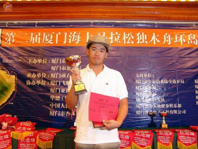由廈門市環保局、旅遊局、體育局主辦的「2005第二屆廈門海上馬拉松獨木舟環島挑戰賽」,金門技術學院運管系三年級王仲豪同學在16隊激烈角逐中,力敗群雄,勇奪單人艇冠軍,優異的成績令人刮目。 這項比賽原定於本(十)月三日舉行,因龍王颱風延期至五日舉行,金門代表隊由國立金門技術學院運動管理系主任董燊領軍,競賽活動組林本源組長擔任教練,隊員王仲豪、戴志強、吳述峰、洪玉蘋、呂憶琳、嚴永鴻、洪明福等人,並在金酒公司贊助下前往廈門參加比賽。 比賽共分單人艇及雙人艇兩組方式,每組可採接力或獨力完成划廈門島一圈(約45公里),金門隊王仲豪同學在16隊激烈角逐中,單人以一小時零六分完成划廈門島一圈,榮獲單人艇冠軍,成績優異,第二名是廈門海警隊,第三名是廈門頑石隊,雙人艇冠軍則是廈門飛鵬隊,第二名是廈門海警隊,第三名是廈門頑石隊。 董燊指出,近年來國立金門技術學院一直推展水上運動,從這次賽事正可以驗收成效,而能有這樣的成績要特別感謝行政院體委會、金門縣政府及金酒公司的支持,金門港務處、觀光局、岸巡總隊的協助訓練才能成功,也希望金門地區有興趣的水上運動同好能一起來共享,更期盼金門地區有機會也可辦理獨木舟環島挑戰賽,促進本地運動觀光發展。