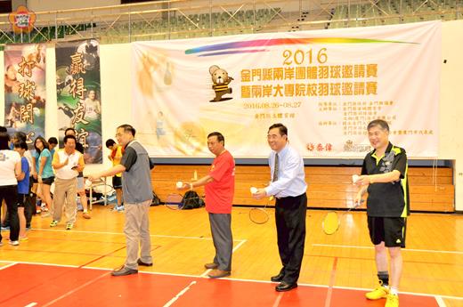 2016年金門縣兩岸團體羽球邀請賽暨大專院校羽球邀請賽,在大陸十一支參賽隊伍因係以觀光簽證來金,而非體育交流簽證,致無法上場比賽,令主辦單位深感遺憾。因此,昨日傍晚在金門縣立體育館舉行的開幕典禮,只有台金十二支隊伍參加,副縣長吳成典也以羽球運動適合東方人,且是很好的運動,並鼓勵縣民多多來打羽球健身。 這項羽球邀請賽,八月二十六日至二十七日在金門縣立體育館舉行。昨日下午五時並舉行開幕典禮和開球儀式。包括副縣長吳成典、教育處長李文良、金門大學管理學院院長董燊、金門體育會理事長李金贊、金門縣羽球協會理事長許燕政等,也都到場參加,為選手加油打氣。 這次比賽原邀請隊伍,社會組有龍海市天行健羽球隊2隊,廈門四海羽球隊、廈門國貿羽毛球俱樂部、廈門羽朋羽毛球隊、廈門萬匯恆通羽球隊、廈門市迅安羽球隊、廈門雷羽球會、廈門鷺友偉士體育俱樂部、晉江市安海羽球協會、台北天母2隊、摩亞2隊、南山人壽及本地金門羽球協會、金城體育會共17隊,大專組台灣大學、台北大學、清華大學、嘉義大學、湖南師大及本地學生連隊共6隊。 在大陸球隊無法上場比賽的情形下,邀請賽變成台金隊伍切磋球技的比賽,讓暑熱的金門縣立體育館熱鬧非凡。
