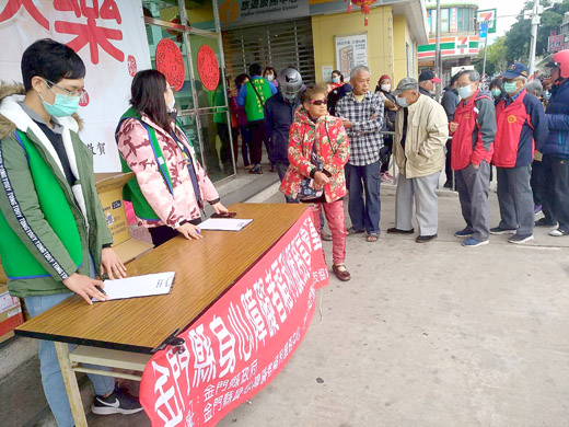 排隊領酒精消毒濕巾!「武漢肺炎」疫情導致人心惶惶,由寶雅金門店提供的500多份「酒精擦」消毒濕紙巾,昨(7)日下午委託社團法人金門縣康復之友協會在金城車站及山外車站同步發送給身障朋友,身障者可憑身障證明領取2包酒精擦拭紙巾,昨日吸引至少200人以上前往領取,在口罩、酒精一份難求的現在,顯得格外珍貴。 在寶雅金門店的協助下,社團法人金門縣康復之友協會募集到消毒用「酒精擦」紙巾一批,在武漢肺炎疫情延燒之際,於昨日分別在金城車站及山外車站發送給金門地區的身心障礙者,身障者可憑身障證明領取。 昨日下午1點在山外車站,有好幾十位民眾前來排隊領取,每人可領到2包酒精擦拭紙巾,可用於擦拭消毒。康復之友協會表示,這批消毒物資是由金門寶雅店提供,委託康復之友協會幫忙發送,昨日在金城車站和山外車站都各有超過100位民眾前往領取。康復之友協會表示,剩餘沒有發送完畢的物資,將會送去福田家園等地區弱勢機構。 康復之友協會感謝提供物資的寶雅金門店,並表示雖地區尚未出現病例,但在防疫的當下,於日常生活中,環境消毒與勤洗手反而是更重要的防疫方式;因此提醒民眾,與其瘋搶口罩,不如做好相關的清潔。在另一方面,專家也指出,這次武漢肺炎的病毒,是可以透過酒精消滅的;而做好相關的清潔,除了可以避免武漢肺炎的傳染外,也可以避免感染其他的流行疾病,包含最近正在大流行的流感等。