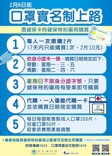 憑健保卡買口罩!「武漢肺炎」疫情延燒、人心惶惶,導致全民搶購口罩之亂,行政院3日晚間宣布最新規定,自明(6)日起採「購買口罩實名制」規則,民眾可憑健保卡到健保特約藥局購買口罩,每人7天內可買2片,一片5元,依身分證最後一碼分流,單數者可在星期一、三、五、日購買,雙數者(包括0)可在星期二、四、六、日購買,金門共有10間健保特約藥局,金寧鄉、烈嶼鄉、烏坵鄉沒有健保特約藥局,請洽當地衛生所。 全金門地區的健保特約藥局共有10間,金城7間、金湖2間、金沙1間,包括:大賀藥局(金城鎮北門里民生路3號,082-327678),大森藥局(金城鎮民生路28、30號1、2樓,082-325100),沛禾藥局(金城鎮民權路140號,082-323520),康總藥局(金城鎮西門里莒光路156號,082-316053),百泰藥局(金城鎮西海路1段1號,082-312832),大愛藥局(金城鎮東門里民族路16號,082-312266),金志忠藥局(金城鎮東門里莒光路11號,082-325813),大山藥局(金湖鎮新市里中正路2號、2-2號,082-333290),仁愛復興藥局(金湖鎮新市里復興路40號,082-332368),大金藥局(金沙鎮汶沙里五福街1號,082-355382)。另外,金寧鄉、烈嶼鄉、烏坵鄉沒有健保特約藥局,請洽當地衛生所(金寧衛生所082-325735,烈嶼衛生所082-362078,烏坵衛生所082-666002)。 「武漢肺炎」疫情引發全民搶購口罩之亂,為解決亂象,行政院3日下午由院長蘇貞昌親自主持跨部會會議討論後,拍板定案「購買口罩實名制」規則,將從2月6日起開始實施,民眾想購買口罩,必須使用健保卡在全國6000多家健保特約藥局購買,每個人在7天內限購2片,一片降價為5元。 根據「購買口罩實名制」規則,每人一次限購2片口罩,7天內只能買一次,一次最多買2片,每片5元。且依照購買人身分證最後一碼做分流,身分證末碼為單數(1、3、5、7、9)者可在星期一、三、五購買口罩,身分證末碼為偶數(0、2、4、6、8)者可在星期二、四、六購買口罩,星期天不限身分證字號,只要健保特約藥局有營業,均可購買(但仍受7天內買2片之限制)。 若要代購者,一人只能代購一卡,也就是一個人最多能拿2張健保卡去買口罩,最多可買4片。行政院表示,每日每個販售點配額為,成人口罩200片、兒童口罩50片(兒童口罩購買規則、價格均與成人相同),但會依實際產能調整。 不過,消息一出,金門有網友精算,金門有10間健保特約藥局和5間衛生所,按照中央分配規則,每家每天配發200個成人口罩、50個兒童口罩,7天共配發,2萬1000個成人口罩、5250個兒童口罩。網友就說,若每人7天限購2個,7天內只有1萬500位成人與2625位兒童,可取得口罩,數量嚴重不足。 對此,縣府建設處代理處長文水成表示,每日更新地區商家存貨公開的調查,還是會持續進行,但他也坦言,中央此次的分配措施,反而給金門的數量會少很多。縣府觀光處表示,目前已跟中央積極反映,希望給金門的口罩數量要足夠,但台灣的藥局很多,金門的藥局數量明顯少很多,但中央只說會再研議。 行政院表示,口罩配送物流將由中華郵政接手,5日晚間就會送到各家藥局,民眾6日一上班就買得到。新措施將讓各家藥局的口罩存量公開透明,已委由政務委員唐鳳與架設「超商口罩現況回報」地圖的工程師團隊聯繫,將合作開發「藥局版」口罩存量系統,未來哪個藥局口罩還有貨,只要上網查就一清二楚,不用擔心店家囤貨不賣。 行政院表示,口罩實施實名制後,指揮中心將提供口罩的指引地圖,將告知哪間藥局已售完、哪間藥局還有販售,以免民眾不用空跑,並可達合理分配。購買口罩的地圖將於2月6日實名制實施時,同步於網上供民眾查詢。購買地圖將也可從「全民健保行動快易通」APP軟體,公告購買地圖與可購買口罩的健保合約藥局資訊。 行政院表示,實施實名制後,口罩銷售就有清楚的數據可以檢討,只要一但市場降溫,限購數量、期間等實施方式,隨時可以調整。而全國有52個偏遠鄉鎮沒有健保特約藥局,將請縣市政府所轄的衛生所協助販售口罩;行動不便的獨居長者、身心障礙者等,將請疫情指揮中心協調地方政府釋出存量,提供給需要的弱勢族群。 經濟部表示,從3日起每天口罩的產能為320萬片,本周以此為目標,國軍加入後可望再提高產能,政府也已決定買機器投入增產,1個月後的目標是日產能1000萬片。