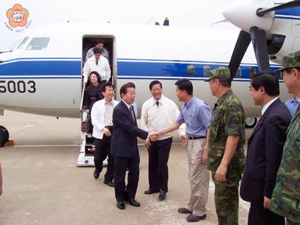 行政院長謝長廷昨日近午蒞金,展開就任院長後的首度金門行,除專程前往后浦城隍廟,參加浯島邑主城隍遷治325週年慶典,敬獻「護國佑民」匾額,下午則轉往視察金湖國小女子體操隊,贈送五十萬元紅包,並允諾支持該校體操館的興建,隨即於下午搭乘專機返台。 謝長廷係由行政院秘書長李應元、教育部次長范巽綠、行政院發言人卓榮泰等人陪同,於中午十一時五十分飛抵金門,福建省政府主席顏忠誠、金門縣長李炷烽、立委吳成典、金防部司令吳達澎、政戰主任周軍橋、福建省政府秘書長翁明志、委員陳滄江、林火孟等多人在機場接機。 一行人隨即前往今年城隍遷治慶典爐主東門代天府上香致意,在樂隊鑼鼓、鞭炮聲的開道之下,由莒光路徒步前往城隍廟敬獻「護國佑民」匾額,沿途吸引好奇鄉親的圍觀,許多民眾高聲歡呼,表示歡迎,謝長廷也一一揮手致意。 行經中興路陳氏宗祠附近,金門縣八二三台海戰役戰友協會理事長陳永財率理監事多人,舉著書寫「還我金門八二三榮民年節慰問金」的白布條陳情,不過,被隨行人員隔開。 謝長廷在眾人引領下,進入城隍廟上香、獻匾後,經過反地雷反廢彈簽名連署活動處,準備登車離開時,民政局長洪國正上前邀請謝長廷簽名支持,不過被行政院秘書長李應元技巧地架開。 下午二時,謝長廷等人又前往金湖國小,視察該校女子體操隊,在教練的帶動下,「謝爺爺好」的呼聲此起彼落,讓謝長廷又開心又尷尬。小選手們以精彩的體操表演歡迎謝長廷,謝長廷則回贈五十萬元的紅包鼓勵。 金湖國小校長陳麗玉、擔任金門體操運動委員會主委的福建省政府委員陳滄江,分別報告金湖國小體操隊成立過程、近年來的比賽成績、目前所遇到的困境等,二人表示,由於缺乏專用體操館及訓練場地,小選手們基於安全考量,高難度的動作,無法充份訓練,以致成績無法更大幅度地突破,雖然縣府陸續編列一千八百三十萬元做為興建體操館經費,但離興築標準體操館尚不足二千五百萬元,希望中央全力支持。 謝長廷除了讚揚體操小選手們吃苦的精神相當難得外,也勉勵大家,只要不放棄,持續練習,一定可以在奧運體操場上嶄露頭角,對於金湖國小興建體操館的訴求,他也表示支持。隨後,一行人趕往機場,於下午三時二十分搭機返台。 此外,縣府也針對地區需要,研提十五項提案,於行程中呈交行政院長謝長廷,希望爭取中央的支持,俾利金門未來可長可久的發展。(相關新聞刊第三、四版)
