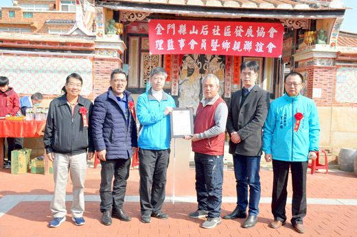 經過短短半年時間的籌備工作,金門縣山后社區發展協會在金鼠年一來到就創會成功,並在昨(一)日隆重舉辦山后社區發展協會第一屆理監事頒發當選證書暨鄉親見面會典禮活動,金門縣議會副議長周子傑、縣府社會處副處長李文堆、金門縣工策會副總幹事王石堆等貴賓到場觀禮及祝賀,山后社區居民也相當踴躍到場參加,共同慶祝社區發展協會的成立,將在新任理事長梁長傑帶領之下,理監事職員和居民齊心齊力,促進山后社區永續發展及更美好! 山后社區發展協會第一屆理監事授證就職暨鄉親見面會典禮活動於昨天上午十時,假山后梁氏家廟前廣場舉辦;在典禮之中,縣府社會處副處長李文堆首先代表縣長楊鎮浯頒發第一屆理事長當選證書給梁長傑及祝賀。同時,李文堆也表示山后成立社區發展協會後,有任何需要協助的地方,縣府社會處一定全力幫忙。 社會處副處長李文堆並肯定山后社區成立過程之中,山后社區協會新任理事長梁長傑相當用心,並在短短半年時間內就完成社區協會成立事宜,是一件非常不簡單的事,也祝福山后社區會務一年比一年進步,永續發展下去! 接著在典禮中,梁長傑立即以新任山后社區發展協會理事長身分,分別頒發當選證書予理監事,期群策群力,共策會務及社區的發展與繁榮。同時,梁長傑也談到山后社區協會籌備創會過程,在去年一月,金沙鎮長吳有家說起山后是三山里最大鄉社,為何未成立社區發展協會;於是經過半年多的努力,並積極鼓勵及經三山里長陳賜發、山后多位熱心賢達居中協助,終讓社區發展協會創會成立,整個成立過程感受到縣政府及金沙鎮公所團隊的熱誠與積極幫助。 正值「武漢肺炎」防疫期間,山后社區發展協會在理監事授證暨社區鄉親見面聯誼活動,山后社區並自主以酒精消毒、宣導防疫及戴上口罩與防疫事宜。另在社區鄉親見面聯誼茶會中,山后社區協會也改為點心餐盒,發給參加居民帶回,期共同做好防疫工作。 梁長傑表示,自從一年半前接任金門縣梁氏宗親會理事長以來,有鑑於社區有很多長者,陸續舉辦多場金門傳統美食,包括有豆渣圓、湯圓、金瓜粿、肉粽等分享品嚐活動,目的主要是宗親聯誼及鼓勵鄉里內居民與老人家,均可在居家旁參與聚會聯誼活動。梁長傑也說,山后村民青壯年以外地工作居多,留在村裡大多是老人家,舉辦活動可聚集村內頂堡、中堡及下堡各堡鄉親聯繫感情,更可提供村內老人家聊天及品嚐回憶古早美味,進而做好長者服務。 梁長傑表示,未來更需要青壯鄉親多多出來參與投入社區發展會務,希望陸續可以成立志工隊、巡守隊,並感謝縣府社會處、金沙鎮公所提供活動經費補助,也特別感謝副議長周子傑補助社區設備,未來將更努力使山后社區持續成長茁壯,努力跟上成立多年的社區腳步。 副議長周子傑致詞時,他首先恭喜新任理事長梁長傑及理監事授證上任就職,在金門地區眾多社區發展協會當中,山后社區發展協會可能是最後成立的,但也是金鼠年第一個成立的社區發展協會,尤以一個社區協會成立不容易,經營更難,也是他回饋山后社區的時候,並感謝山后鄉親對他的愛護與支持,能有機會為地方和鄉親服務。 山后社區發展協會是新成立社發會,要在成立一年之後,才能取得政府社區補助的條件。因此,周子傑用議員補助款,支持山后社區發展協會,在社區成立之初,添置社區協會相關設施設備,以利會務推動,凝聚社區向心力量。 周子傑也期許山后社區發展協會發揮凝聚向心力,致力推動社區營造、共餐、長照2.0,迎頭趕上其他先成立的社區協會,而且做得更好!最後,他向大家拜個晚年,祝大家金鼠年行大運,並提醒在武漢肺炎防疫之中,大家要照顧好自己的健康! 金門縣工策會副總幹事王石堆表示,所謂創業維艱,社區發展協會創會不易,希望大家共同合作,為社區鄉里努力,支持社區會務、活動及財務健全,忠孝新村社區也願意分享,以及共同學習、發揮母雞帶小雞,使忠孝、山后社區鄉里發展更好! 王石堆也表示,如果有年輕孩子想創業和有相關創業資訊需求的,或是工商服務的,都可找金門縣工策會服務;同時,他也代表縣長楊鎮浯致贈一打金門高粱酒,祝賀山后社區成立發展協會、大家身體健康、新年快樂! 山后社區發展協會係由金沙鎮三山里的頂堡、中堡及下堡所組成,自然村居民主要係以王姓、梁姓為大宗。昨天出席參加山后社區發展協會創會理監事授證暨鄉親見面會典禮有理事梁志忠、王美玉、梁子文、林少雄、王光耀、王世生及常務監事梁子友、監事楊良才等及鄉親約六十餘人,洋溢著新年新氣象! 山后社區發展協會理事長梁長傑指出,在山后高砲營房房舍結構完整且堪於使用,空間夠大,他將建請金沙鎮公所協助居中協調,讓山后社區借用,俾利舉辦聚會相關活動。同時,他說山后社區發展協會起步較晚,但總算是凝聚的第一步,況且社區是大家的,希望居民踴躍參與社區事務,一棒傳一棒,共促山后社區的繁榮。