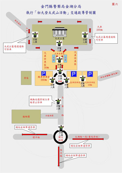 農曆初九(2月2日)登太武山拜拜祈福是金門地區民眾承傳已久的習俗,為因應活動帶來之人潮與車潮,金門縣警察局金湖分局屆時將於太武圓環、玉章路、太武公墓及周邊道路實施交通疏導管制措施,以維道路之行車順暢及人車安全,請行經該路段之駕駛人配合員警或義交人員之指揮。 金湖分局指出,初九登太武山活動周邊道路交通疏導管制措施如下:一、停車區部分:太武公墓周邊道路已協調金防部於當日上午開放汽車停車,太武公墓前方廣場為汽車停車區。面對天地正氣牌樓右方為大型車及汽車停車場,左方為機車停車場(見圖)。二、交通管制部分:太武公墓周邊道路為單向逆時鐘方向通車。太武公墓前方廣場中央花臺路段禁止停車,玉章路(天地正氣牌樓至太武圓環路段)禁止停車。三、如規劃之停車區域均停滿,則於太武圓環處管制車輛進入。開放車輛於太湖路一段、伯玉路及環中路等路段靠右側單邊停車。 金湖分局分局長黃維章表示,農曆初九登太武山拜拜祈福,為民眾多年來之重要活動,為使交通順暢,特派員實施交通疏導措施,相關之交通疏導管制措施可於金門縣警察局(金湖分局)網頁及臉書上查詢,請出遊民眾事先上網查看,汽、機車駕駛人請聽從警察人員之引導停放車輛,以維持交通之順暢。