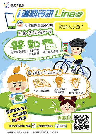 金門縣政府教育處指出,為了提供國人正確運動知識,教育部體育署透過i運動資訊line@帳號,以生動活潑的方式傳遞運動知能,好友人數已達6萬,年度資訊觸及人次超過700萬,體育署表示將持續推播運動健康資訊,破解運動迷思,呼籲愛運動的民眾加入line好友(ID:@isports),讓自己動得正確又健康。 i運動資訊line@帳號以令人莞爾的標題,例如「動茲動吃:運動前後到底該怎麼吃!」、「天公伯啊~到底要怎麼做才能瘦下來?」、「運動完虛累累:鬆一下讓足更健康~」,將正確運動知能傳遞給大家,同時破除似是而非的運動迷思,讓民眾動得更正確、更健康。今(109)年將舉辦月月抽活動,並搭配節慶精心規劃貼圖/文主題及代表人物(如虎爺、媽祖、土地公&土地婆),此外,還有線上與實體活動,希望有更多民眾加入成為好友,圖文選單中的「運動地圖」及「教材專區」也讓民眾能更便捷地尋找運動地點及運動資訊。農曆年節剛過,i運動資訊line@帳號隨即推出應景的「年後收心操」及「年後減肥」主題,提供實用的運動資訊。 體育署邀請愛運動的民眾,在line軟體「加入好友」選項中搜尋@isports,或掃描QR Code(如圖)加入好友,並將帳號推薦給親朋好友,一起運動享好康,越動越健康。