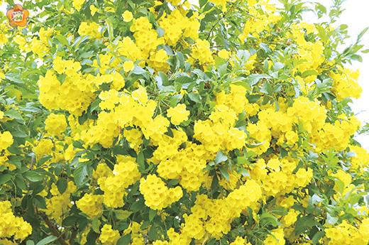 李增汪/圖文 屬於熱帶花卉的黃鐘花又開花了,讓暑熱的夏季枝頭帶來花美的詩意,真是美呆了! 原產於南美洲的黃鐘花,地區也有人種植。每到開花期,滿樹黃色花朵,近看、遠看,都美不勝收。 黃鐘花(學名Tecoma stans)是屬於熱帶花卉,但卻能忍受零下十二度的低溫,可見其韌性。 黃鐘花是大型灌木,可以長至一到三公尺高,頂生,圓錐花序,能以種子繁殖,但目前大多以扦插繁殖,很容易成功。國內有人在花謝後即刻修剪枝幹,再施加追肥,沒多久就又能開花,所以能持續整年開花。 黃鐘花開花時呈黃色的鐘形花,所以被命名為「黃鐘花」,其種子以長豆莢的果莢存在。黃鐘花屬紫葳科,為常綠灌木,葉對生,奇數羽狀複葉,三至十一小葉;或有單葉。花為黃色,頂生喇叭狀,花冠漏斗狀鐘形,花萼為茼狀鐘形五淺裂。蒴果線狀。種子狹橢圓形,具有薄大的二翼,像二大翅膀。 黃鐘花適宜庭園樹或盆栽,可供觀賞。開花期以夏季及秋季為主。