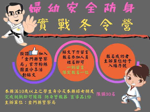 為強化本縣學生及婦女自我防衛能力,並提升遇害時,即時防範之反應能力,爭取保護自身安全的機會,縣警局特規劃辦理「婦幼安全防身—實戰冬令營」,教授自我防護觀念、如何利用隨手可得之物防身及技巧防身以迴避危險情境。 這項婦幼防身實戰冬令營,2月1日(星期六)上午9時起至12時止將在金城分局3樓柔道場展開,活動除了宣導尊重性別平等、保護身體自主權、分享婦幼新聞案例及相關法律知識外,另為提升學生遇害時即時防範之反應能力,特別現場教授防身脫逃技巧,並安排霹靂小組精湛的戰技表演。 此外,民眾於現場手機上網瀏覽金門縣警局官方臉書專頁,按讚或分享活動訊息,即可獲得「防身警報器」精美宣導品1份。 縣警局指出,本次活動參加對象為年滿10歲以上學童及本縣婦女朋友,活動報名方式,自即日起至縣警局官方臉書「金門縣警察局」粉絲專頁張貼的「婦幼安全防身—實戰冬令營」貼文下留言登記報名,一則留言限定報名人數一位,並依報名順序給予活動序號,迄至30名額滿為止,另為響應環保,請參加活動之學員自行攜帶環保杯。