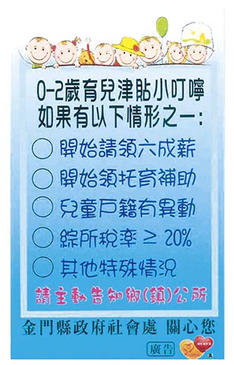 109年度育有未滿二歲兒童育兒津貼總清查已提前完成審核作業,縣府社會處指出,1月份津貼將提前於22日春節連假前發放,預祝大家新年快樂、闔府平安喜樂。 社會處表示,依據育有未滿二歲兒童育兒津貼申領作業要點辦理年度總清查,申請人不須重新提出申請,統一透過中央資訊系統查調辦理,所查調資料為107年綜合所得稅率、育嬰留職停薪津貼及托育補助之申領狀態,清查期間如發現兒童及申請人有失蹤、戶籍遷徙、扶養親屬關係異動或領取其他同性質之補助或津貼等情形者,將以書面通知申請人審查不符結果,預計於109年1月31日以掛號方式寄送,如需補正資料者,請申請人配合辦理於核定通知書收訖30日內補正,逾期將需重新提出申請。 另為響應環保,符合資格者將不再另行寄發核定結果通知書,如對未滿2歲育兒津貼發放程序尚有疑義,請於週一至週五上班時間致電社會處承辦人林小姐或張小姐(082-318823#62599、67582)。