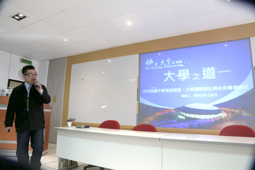 國立金門高中於學期末前假國際會議室,辦理個人申請志願選填及備審資料製作講座,特地邀請佛光大學招生事務處王宏升副處長,蒞金為金門高中應屆畢業生及高二學生講解分析「大學之道」。 王副處長針對目前大學考試考科選擇的異動,製作各大學考科採計的圖表供在場的家長與學生參考,並針對考生申請志願選填,也進行相關的分析與選填策略的提醒;對於備審資料中的自傳與申請動機,提供學生在準備過程中,如何建立強而有力的文字或影像連結,爭取大學端教授的青睞的建議。 對學生而言,剛結束學測考試後,即將面臨志願選填與備審資料的準備,適時提供指引的方針,讓學生與家長有更清晰的架構共同進行學科能力測驗後下一個階段的任務。