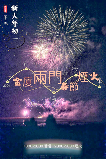 「金廈新春,同門同慶,賞煙花」!「2020年金廈兩岸春節煙火施放活動」,即將於1月25日(農曆大年初一)晚上於烈嶼鄉上林將軍廟前出海口與廈門市環島路黃厝沙灘隔海同步施放煙火,預計施放876發高空煙火與各式一般煙火,透過高空交錯綻放,讓民眾感受歡樂與奇幻,驚喜與浪漫,金門縣政府與烈嶼鄉公所歡迎鄉親踴躍前往烈嶼上林,一同團聚歡慶新年。 今年煙火除了延續去年採用迪士尼的高空煙火,最大的煙火尺寸更是高空12吋的高空煙火。當晚將以連續不間斷方式燃放,從5吋到12吋的各式煙火,輔以各種不同角度的低空煙火,讓煙火施放畫面更具層次感,豐富多元,並搭配震撼的交響樂同步演出,牡丹、菊花、椰子樹、點滅星、錦牡丹與椰子樹、霹靂炮、萬雷與花束、環狀、各色牡丹、群花爭艷、大柳垂條與棕櫚椰心、飛龍、彩花萬雷、萬叢花束、牡丹與菊花、手拉手、愛心等花式的煙火輪番上陣,結束前的設計,更採用獲得觀眾最為好評的「錦冠瀑布煙火」,搭配12吋高空煙火點綴,讓煙火氣氛在結尾達到最高潮境界。 縣府觀光處表示,活動當晚除煙火秀,還有一系列迎春表演節目,一旁也會有暖冬熱食供應,提醒鄉親提早前往會場品嚐甜品、熱食與觀賞表演節目,等待欣賞長達30分鐘的璀璨煙火秀。另外為了方便鄉親前往烈嶼觀賞春節煙火,規劃接駁專車與專船提供鄉親選擇:一、熱食提供:18:00與18:45提供。二、表演活動:18:00至20:00有在地表演團體唐伶樂集、電音三太子、戰鼓與祥獅獻瑞、吉他手與大提琴對話等表演活動。三、煙火施放:20:00至20:30。包括「鼠一鼠二」、「萬紫千紅」、「南國風情」、「鼠鼠生風」、「百花齊放」、「鼠年吉祥」、「雷霆萬鈞」、「孔雀開屏」、「百花獻瑞」、「花開富貴」、「柳堤春曉」、「飛龍在天」、「千輪花雷」、「金玉滿堂」、「花好月圓」、「國泰民安」、「普天同慶」、「美哉兩岸」、「心手相連」、「鼠年行大運」等20個節目。四、交通船:(1)水頭碼頭↓九宮碼頭:建議搭船時間16:30~19:00,並請鄉親提早抵達,以免同時段人潮眾多。(2)九宮碼頭↓水頭碼頭:煙火施放結束後,搭船時間視現場人潮情況機動輸運。(3)預計當日鄉親人數眾多,如遇客滿即採機動對開模式,以利有效疏運。五、接駁專車:(1)九宮碼頭↓上林村:16:30至煙火開始前,鄉親可於九宮碼頭搭乘接駁專車,於上林村下車。(2)上林將軍廟↓九宮碼頭:活動結束後,亦提供返程至九宮碼頭之接駁專車,機動加開。六、交通管制:(1)活動當日水頭港區人車流眾多,16:30起進行交通管制(車輛禁入凸堤路段)。(2)為小金門路段動線順暢,上林將軍廟附近,活動期間將進行單向交通管制。(3)為利接駁專車(遊覽車)行車動線,敬請鄉親配合車輛禁停於濱海大道與上林將軍廟附近路邊,並將車輛停置規劃之停車空間內(上林村辦公處暨社區活動中心旁廣場)。 縣府觀光處表示,農曆新年歡迎鄉親攜家帶眷,踴躍前往烈嶼上林,同慶新年,欣賞煙火。同時注意保暖,以及人身與交通安全,如對活動有任何疑問,可電話洽詢金門縣政府觀光處,電話:082-372267。