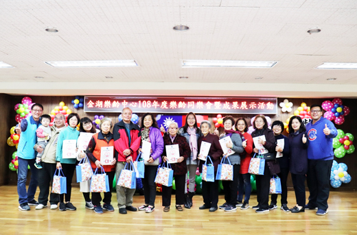 金湖鎮公所所屬樂齡中心,於108年度共辦理樂齡學習課程248場次,共545小時,約有6067人次參與課程。經一年努力後,18日於金湖鎮公所3樓辦理「108年度金湖樂齡學習中心樂齡同樂會暨成果展示活動」,由金湖鎮長陳文顧頒發獎狀以及獎勵品,表揚積極參與樂齡學習課程之學員以及各社區推動樂齡學習工作者以感謝其熱心奉獻及無私的付出。 活動邀請獲表揚之樂齡學員以及各社區推動樂齡學習工作者到場接受各界祝賀,包括金湖鎮民代表李秀華、代表陳向鑫、代表林嘉森、代表陳秀卿、代表會秘書陳翔景等人也前來會場向獲表揚者道賀。 活動表揚108年度積極參與課程之優秀學員以及推動樂齡學習工作者:呂左毓梅、呂添財、陳彩碧、陳麗貞、莊雪碧、呂玉英、吳素娥、楊翠雲、許玉華、陳玉梅、莊宙杜、王翠雲、黃連忠、張彩蓮、董彩慶、李姿縈、許琼娘、翁明金、陳希能、陳治、蔡承土、辛月娟、張馬珍、吳淑華、吳妙慧、李美麗、張清木、王美麗、黃明芳、林紅緞、翁桂治、楊秀華、吳瓊治、呂娶治、陳暖治、謝秀衣、黃淑月、辛月密、呂刊治、楊美華、吳翠錦、林寶華、楊昭治、何梨碧、呂琼真、任秀鸞、黃戀、陳碧宵、黃碧英、王麗珠、楊玉華、董寶璇、李久菜、蔡顯國、王瑞麗、王寶珠、楊巧珠、蔡雪洪、陳招治、陳明珠、陳呂淑女、林亞春、周愛寶、鄭愛英、陳美梨、王黎華、葉鳳嬌、楊秀招、楊水錦、呂世壽、呂寶玉、呂團治、柯秀娥、張琼英、王添雪、陳含戀、謝鴻志、張健治、陳換治、陳淑曉、劉秀華、洪鳳、楊舒晴、蘇婉貞、陳玉梅、陳志成、張彩蓮、吳建業、陳秀玲、薛逸璞、蔡穎臻、陳翔景、陳自強、楊恭正。
