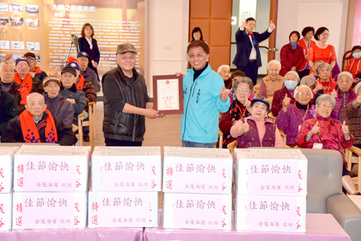 「金廈有情、歲末送暖」,做公益不落人後的金廈海運股份有限公司,於春節前夕,由董事長顏及人及公司代表,接連二日造訪縣內的社福機構,先後慰問福田家園、松柏園老人長期照顧中心及大同之家,表達地區企業對弱勢群族的關懷,並致贈加菜金二萬元及象徵大吉大利的橘子表達關懷,也祝福院童及長者佳節快樂。 14日更邀請了金門縣合唱團一同前往大同之家作關懷表演,由合唱團為機構的住民們獻唱。由李永舜指揮、翁醇溶伴奏的合唱團,共表演了〈回憶〉、〈押花〉、〈賞月舞〉三首歌,美好的歌聲讓大家浸沐在其中,更在大家的安可聲中加唱了〈走在雨中〉。 顏董事長表示,希望透過企業對地方弱勢的關懷,來幫助弱勢群族及關心他們的生活,以盡企業的責任,並讓社會能更祥和安康。因此趁年節前夕率領員工走訪各慈善單位,為社會盡些綿薄之力,同時也可以影響在地的企業,共同來關心地方事務。 金廈海運股份有限公司指出,本著回饋鄉梓的經營理念,以及對地區弱勢團體的關懷之意,祝福園生及長者,希望其能感受到社會的祝福,有一個快樂的春節,亦希望能拋磚引玉,讓地方弱勢團體能感受到溫暖及愛。