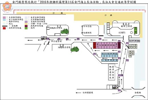 配合縣府將於本(七)月三十日、三十一日假金門縣料羅灣、烈嶼鄉雙口海邊舉辦暨「2016搶灘料羅灣--第14屆金門海上長泳」暨「第八屆兩岸四地金廈海域泳渡」活動,為維護參加活動人員、工作人員行車安全及順暢,縣警局將於活動當日就料羅港區與料羅圓環至料羅灣、烈嶼鄉雙口岸邊等周邊道路實施交通疏導管制(如圖),該局籲請前往參加活動之人員車輛、行經該路段之人車,配合交通警察之指揮管制,俾利整個長泳活動順利圓滿完成。 為帶動地區觀光旅遊、開發金門海上觀光資源,縣府籌備多時之「2016搶灘料羅灣--第14屆金門海上長泳」暨「第八屆兩岸四地金廈海域泳渡」即將在明(三十)日、三十一日正式登場,據主辦單位表示,屆時參加海上長泳活動將包括來自臺灣及地區游泳協會、救生協會、早泳會等團體,可預見屆時活動周邊道路將湧入人潮、車潮,縣警局為維護長泳活動周邊道路行車順暢、人員安全,已規劃相關交通疏導管制措施,請工作人員、前往參加活動人員車輛配合交通人員之指揮行駛。 縣警局表示,海泳現場料羅八二據點海岸周邊道路將自七月三十日上午六時至十二時止進行交通管制,管制措施如下: 參加海上長泳活動之各式車輛一律從靠近白龍橋旁路口之道路進入,並由海龍蛙兵營區前道路往料羅村方向駛出,禁止由料羅圓環海龍蛙兵前道路駛入會場,行車動線管制單向通行。參加活動人員一律於活動現場入口處下車,大客車停放於活動前空地依規劃區域依序停車,小客車停放於大客車後方空地順向停車。環島南路白龍橋附近兩側道路及白龍橋往會場道路禁止停放車輛。為維護參加活動人員安全,長泳入口處至長泳現場之道路禁止任何汽機車進入。