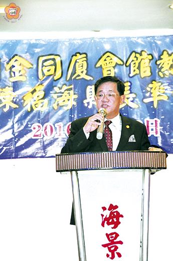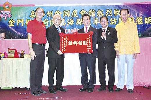 在新加坡宣慰僑社告一段落之後,金門縣長陳福海廿二日下午率領縣府東南亞宣慰僑社訪問團一行,經過五個多小時路程,於當日晚間七時三十分左右,順利抵達馬來西亞柔佛州的第二站訪程地。隨即,陳縣長率訪團拜會柔佛州金同廈會館和交流聯誼活動,受到金同廈會館丹斯里拿督陳成龍和金同廈會館會長郭明發及董事、鄉僑的熱忱歡迎,且相見歡及話家鄉事,場面十分的溫馨和歡樂! 在拜會柔佛州金同廈會館和晚宴於廿二日晚間舉行,陳縣長與金同廈會館會長郭明發互換禮物和贈匾之外,並致贈陳成龍禮物推崇他的成就和貢獻。在致詞時,金同廈會館會長郭明發介紹說,會館成立至今年屆滿五十週年,並將於今年十月下旬舉辦週年慶活動,目前會員有一千二百多位,不分彼此,都是一家人! 他表示,回顧歷史,早年先賢離開家鄉「落番」,來到馬來西亞開墾,披荊斬棘,走過無數的坎坷路,努力耕耘求生存,也成立鄉親會或宗親會加強團結和同心,以及增加凝聚力量,連絡感情,敦親睦族,為族群福利,協助及照顧鄉親在異鄉生活。 時值金同廈會館即將走過五十個年頭,並即將隆重慶祝館慶,郭明發當場邀請陳縣長撥冗到柔佛州,共襄盛舉,必定讓鄉僑感到無比的光彩,促進鄉情鄉誼和與僑社連繫和感情。同時,他指出時代在演進,但金門政府仍無時無刻不在關心旅外各地鄉親,連繫海外僑社和難於割捨的鄉情鄉誼,並能相聚一堂,加強連繫,以及推動交流平台,共同攜手為下一代創造更美好的未來! 丹斯里拿督陳成龍表示,由陳縣長率領的東南亞訪問團,主要目的是為宣慰旅外僑親,並邀請在場與會鄉親給予陳縣長和訪團熱烈掌聲,表示熱忱的歡迎。他說,看到家鄉的人,讓他不禁勾起回金門的情愫和種種記憶,而金門今天已有很好的發展,並感受到自己是金門人,能夠回鄉尋根外,也知道自己是第二十二代,血脈相傳,也要更加努力,才對得起祖先。 陳成龍指出,「落番」影片的拍攝上映,也讓後代子孫了解到當時的老一輩「落番客」,早年飄洋過海到南洋的祖先有多麼的辛苦,也才有我們的今天,一定要感恩!陳成龍對於教育文化十分重視和努力,也讓金門傳統文化傳承,一代一代傳承下去! 陳成龍表示,今日的金門已不再有戰爭,希望金門能發展成為一座很好的寶島,並繼續努力,在既有發展礎上,發展成與廈門是「門對門」,及把海外優秀金門人吸引到金門,讓金門強大起來,讓金門走向世界,並且金門是有足夠的條件! 「兩岸一家親,金門、同安、廈門親上加親!」陳縣長致詞時,他希望鄉僑能把第二代、第三代,甚至第五代、第六代帶回金門,連結鄉誼鄉情,金門一定會更好。同時,他說此次前來東南亞宣慰鄉僑之外,也報告金門發展現況,讓所有僑社及鄉僑了解家鄉進步情形,並指在台灣、東南亞和本地的金門人,加起來有一百多萬人,感謝鄉親給他機會當一位金門縣縣長,也自我期許要做一位「百萬人的金門縣縣長」,為金門這塊土地做點事! 陳縣長也說希望在金門建構一所「戰爭與和平學院」,台灣的、北京的與金門的清華大學來合作,還有與柔佛州鄉僑一起努力,透過教育文化「翻轉」我們的下一代! 另,陳縣長和僑社訪問團也來到柔佛州金同廈會館參觀和交流活動,陳縣長說,縣府將陸續推動五項僑務工作,讓海內外一百萬金門人一起來關心金門、投資金門,讓金門越來越好! 此外,在拜會柔佛州金同廈會館晚宴上,金同廈會館和縣府藝文表演團均帶來精彩的表演,其中金門浯江舞蹈團及紫韻箏樂團演出有金門高粱香的(古箏)、金彩金門~高粱美酒(舞蹈)、鬥嘴鼓~金門拜拜的風俗、風雞之島~秋吟芋語(舞蹈)、鬥嘴鼓~鄉親我愛你、閩南風~閩南民謠組曲(古箏)及草螟弄雞公、桃花過渡、丟丟銅仔的節目表演,增添鄉情的氣氛。