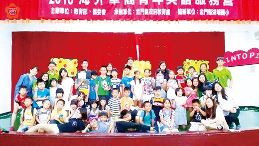 湖埔國小今年暑假辦理為期兩週的海外華裔青年英語服務營圓滿結束,參加學生成果發表以英語音樂劇的方式為活動畫下圓滿的句點。教育處副處長陳金文也應邀參加結業式時指出,金門為英語教育投入很多的努力和資源,尤其在湖埔國小我們也看到了雙語教育正在發芽,未來期待金門第一所雙語學校就座落在湖埔國小。 為鼓勵海外華裔青年投入國內英語教學活動,提升教學資源缺乏地區國小、國中學生及弱勢族群學習英語機會,平衡城鄉差距,並促進海內外青少年交流,教育部與僑委會每年皆會辦理海外華裔青年英語服務營,邀品學兼優的海外華裔青年來臺,經為期約一週的培訓後,深入國內偏遠地區的國中小學,進行暑期英語營的教學活動,讓華裔青年透過英語教學服務,增進對臺灣的認識,以及對中華文化及臺灣優質文化之認同,也讓國內的國中小學生體驗不同的英語學習模式,也在與來自海外的大哥哥大姐姐們的互動中,拓展了宏觀世界的國際觀。 湖埔國小透過縣府教育處向教育部國民及學前教育署及僑委會申請辦理海外華裔青年英語服務營,提供偏鄉學生暑期英語學習與體驗學習。今年6位來自美國各州的華裔青年志工抵金進行二週的教育訓練,金門大學應用英語系的實習生從旁協助華裔志工設計英語教學課程,學生在六位來自美國的華裔青年引導下,體驗了把英語充分融入生活、活潑有趣的學習課程;於 (廿二)日下午舉辦結業式。經過二週的朝夕相處,六位美國大哥哥大姊姊們還很捨不得跟金門的小朋友說再見,主辦單位表示,海外華裔青年英語服務營的主要目的,除了提升教學資源缺乏的地區國中小一個英語學習機會,也讓海外華裔青年在各鄉鎮的服務學校期間,對於臺澎金馬地區生活以及中華文化有更深的認識。 湖埔國小目前致力於雙語教學的發展,責無旁貸的也申請了今年的海外華裔青年英語服務營,辦理時間自7月11日至7月22日為期兩週,共有6位來自美國馬里蘭、紐約、波士頓等地的華裔青年到校進行英語服務營隊,同時也引進金門大學應用英語系的實習生從旁協助,服務營每天上午及下午分別準備不同的主題,從問候、數字、年齡、時間、氣候、飲食到節慶教學,為湖埔國小學童帶來生動活潑的英語學習體驗。更透過勞作、投影片、英語小遊戲、戶外教學、歌曲聽唱等充滿趣味的活動,讓孩子們在輕鬆愉快的氣氛下吸收英文知識。此外,為了讓華裔志工們能融入本地生活,促進文化交流,湖埔國小也特別安排他們住在寄宿家庭,家長們也相當熱情的接待,華裔小老師們在課堂外也與學生們打成一片,讓他們有賓至如歸的感覺。 經過二週緊鑼密鼓的英語營課程,廿二日下午於大禮堂舉辦結業典禮,國小學童們在成果表演上是使出渾身解數,將兩週來的學習成果展現出來,除了英文歌曲演唱之外,還有英文童謠加上逗趣的舞蹈;高級班還應用前天才學的句型演了短劇,這些精采的表演為為期二週的英語營畫下美麗的句點,更讓同學們贏得意想不到的收穫與一生永難忘記的暑期回憶。 校長楊肅藝也感謝家長能到場參與孩子的教育活動,對於海外華裔青年及金門大學應用英語系的實習生這兩週來辛苦與努力也表示高度的肯定,此外,寄宿家庭對於海外華裔們的生活照顧與包容更是功不可沒,期待未來還能有機會再度辦理類似的活動。 在學生表演完之後,六位海外華裔青年也一一上台發表這次營隊活動的感言,他們覺得雖然一開始對於英語的教學很陌生,甚至有點惶恐,但看到小朋友熱情的對待、認真的投入課程活動和開心的表情,他們就放心了,他們尤其感謝寄宿家庭們及湖埔國小對他們的照顧,真的讓他們覺得SO SWEET!希望已後還可以繼續保持聯絡。 結業式結束後華裔青年們也跟學生、家長們一起合照,大家離情依依,場面溫馨。