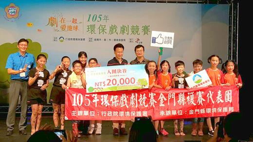 由行政院環保署主辦的105年環保戲劇競賽北區複賽,於昨(23)日假台北市客家文化主題公園劇場2樓舉行,本縣金沙國小在強敵環伺下,擊敗眾多對手取得8月7日全國決賽的參賽權,將再次與全台北、中、南三區的勁旅爭取最高榮耀。 昨日環保戲劇競賽北區複賽,來自台灣北區8縣市共15隊的表演隊伍齊聚一堂,共同透過戲劇表演的方式,宣揚環境保護的理念。本縣歷經5月份初賽選出代表隊伍開瑄國小及金沙國小等2隊,由環保局局長傅豫東率隊赴台參賽,最後在全場爆滿觀眾的見證下,本縣金沙國小突破重圍,取得進入全國決賽的參賽門票,表現令人讚賞。 環保局指出,本次北區複賽儘管受先前尼伯特颱風影響延期,仍然不減參賽選手們的高昂鬥志,更吸引了爆滿的觀眾擠進會場,只為幫努力多時的孩子們加油,金沙國小的小選手頂著強敵環伺的壓力,把平日練習的成果完整呈現,並配合使用環保元素製作的道具,以「鱟」為特色並用詼諧方式的演出,內容又緊扣環保概念,讓台下的觀眾看得目不轉睛,精彩的演出獲得滿堂喝采,吸引了評審的青睞不負眾望的取得北區複賽晉級全國決賽的門票。 開瑄國小則是以中西合併,用穿越時空的概念為演出內容,把平常練習成果展現出來,小選手演出同樣精彩,吸引眾人眼光,只可惜以些微差距無緣晉級最終決賽。 環保局長傅豫東表示,本屆為金門縣第二次參與全國環保戲劇競賽,去年首次參與則由金湖國小勇奪銀牌,盼本次的金沙國小能夠再創佳績,讓外島金門能夠再次發光發熱。而為了協助金沙國小能夠有更精彩的演出內容,環保局將再次邀請擁有豐富戲劇指導經驗、且去年協助本縣奪牌的錢康明老師,使本縣在推動環境保護的成果,能夠以更多元的方式呈現,藉此提醒世人環境保護的重要性,人人都應該為環保盡一份微薄心力。