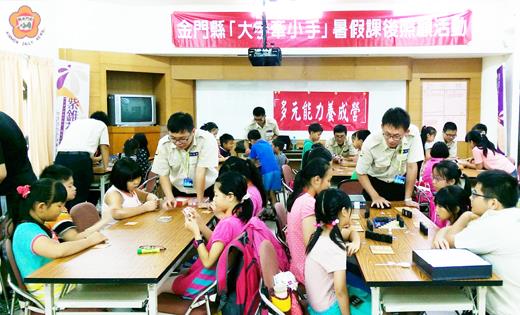 救國團金門縣團委會與金門縣校外會,暑假推出兩梯次的「多元能力養成營」-大手牽小手課後照顧活動,共計有八十位學員參加,今年在替代役協助下,增加城市規劃師、分齡桌遊體驗等課程,寓教於樂,學子在遊戲中獲得啟發,深受好評。 兩梯次的「多元能力養成營」-大手牽小手課後照顧活動已圓滿落幕,各吸引四十位學生參與,活動中除了安排拒菸、反毒、反霸凌及法治教育等青少年服務知能宣導,引導青少年度過一個健康的假期。此外,今年課程內容在持續創新,特別增加了一堂「城市規劃師」數學多元學習課程。由數學系畢業的替代役男自行設計教材教案,在營隊中帶領小朋友從蓋住宅、車站、百貨大樓及工廠等,學習分析不同的成本與效益,使學童學習數學外,同時也能融入城市設計,環境規劃,合作溝通,與問題解決與應變等多元化能力。 另外,廣受學子熱烈好評的創意桌遊課程,今年更特別依不同的年級學生,引進不同能力的桌遊教材,使學子在活動中培養專注力、耐性、邏輯和團隊合作精神,遊戲化的教材資源,也讓學子各個在歡樂中學習。課程最後,縣府教育處、救國團、校外會與會貴賓頒發結業證書與獎狀、獎品給學子,也在掌聲和歡笑聲中為營隊活動劃下圓滿句點。 救國團總幹事陳建成表示,感謝家長對救國團的肯定,辦理暑期營隊的目的是希望,在假期為學生提供良好的學習環境、充實歡樂的課程,豐富假期生活也讓學生能擁有健康的成長過程。未來救國團仍將繼續結合各機關單位團體共同合作,持續為青年學子們,提供各項具公益性、教育性、服務性、健康性的活動。 金門縣校外會督導張智芳指出,這次與救國團聯合辦理活動,感謝縣府教育處、衛生局、少年隊、地檢署等對活動的協助和支持,營隊期間由具有相關專業與服務熱忱的替代役男,擔任小老師、隊輔人員陪伴小朋友,除有效讓金門縣教育服務役役男人力充份發揮,也是對學生校外生活輔導的延伸照顧。