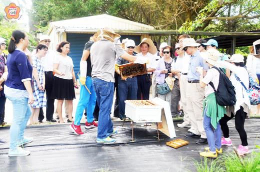 中華民國農業教育學會移師金門舉辦「第八次理監事聯席會」,選定金門農工召開,開會前夕,由農業教育學會理事長陳世雄帶隊,一行34人參訪金門農工發展有成的養蜂場,品嘗該校生產的蜂蜜泡成的蜂蜜茶。 農業教育學會日前於金門農工舉辦「第八次理監事聯席會」暨金門農業教育專家座談會及產學合作參訪,由農業教育學會理事長陳世雄帶隊,一行人包括許多農工學校校長等共34人,造訪金門;在金門農工召開理監事聯席會之前,一行人先到金門農工養蜂場參訪金門農工養蜂情形。由金門農工校長劉湘金與園藝科主任蘇文勝一同介紹養蜂場,現場還準備由金門農工養蜂場生產的蜂蜜泡成的冰涼蜂蜜茶,大家喝了讚不絕口。 金門農工園藝科主任蘇文勝表示,金門農工自104年申請為期2年的特色課程計劃,內容包括養蜂與食用花卉,並聯絡農教學會協助養蜂教學事宜,104年8月進行第一次養蜂初階工作坊,之後各校老師與農友都覺得很有幫助,今年4月與6月續辦進階養蜂工作坊。適逢今年農教學會理監事會在金門舉辦,所以農教學會也一起來交換協助與參觀本校養蜂情形。 蘇文勝說,金門屬低汙染開發區域,環境保留多樣化的生態特性,也為地區的蜜蜂培育提供良好的環境。同時就由蜜蜂的採蜜與授粉,讓植物能增加結果的機會,同時也能加強物種多樣性的環境庫,為地區學生培育生態保育觀念的人才。也能讓學生增加對養蜂業的認識程度,對於未來就業時是否會選擇養蜂業,未來如果想要從事副業時的選擇,學生學習完特色課程後對於蜜蜂培育、蜂及蜂副產品採收利用的技術純熟度能否提升,學習特色課程後是否可以幫助具有就業的能力。在核心課程裡,從植物保護學中的昆蟲章節來瞭解蜜蜂的特性與培育方式;果樹學讓學生辨認果樹的蜜源有哪些和如何繁殖栽培;以作物生產實習讓學生進行實際蜂群培育管理和蜂蜜採收實務;園產品處理與利用來進行蜜蜂及蜂產品多樣化的利用;刺激學生多元思考如何將蜜蜂培育和蜂產品利用融入專題製作中。 蘇文勝指出,許多植物都能產生蜜源,可以誘引蜜蜂採蜜並進行授粉,藉此可以維持植物多樣性的基因交流,增加生態的豐富度。另許多作物與花卉,本身已具食用性或藥性,若與蜜蜂採蜜習性相符,讓蜜蜂採集其花蜜與花粉,則可增加相關收入,故在一開始選擇作物種類時,就需栽種符合我們要求的作物。而金門為離島地區,相關栽培的土地與氣候條件皆與台灣有異,若要發展可供蜜蜂採蜜且本身又具實用價值的作物,則須要有前期的栽培經驗。從蔬菜、花卉及果樹栽培讓學生了解不同的蜜源植物,除了可作觀賞植物和可供食用花卉的蜜源植物,並進行培育與種植經驗的累積和蜜源植物的多樣化利用;花卉利用與園產品處理與利用課程,來進行蜜源植物與蜂產品的包裝和食用花卉的加工與多元利用;刺激學生將蜜源植物培育和蜜源植物產品採收融入專題製作中。