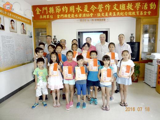 由經濟部水利署指導、金門縣愛護水源協會及財團法人金門縣張文夏、黃玉燕紀念館教育基金會舉辦的「金門地下水環境保育推廣教育作文班」昨日結業,水利署組長簡昭群特別趕赴金門頒獎,他並期許藉由作文班的舉行,讓學童瞭解保護水資源的重要性,為金門灑下節水保水的種子。 為使學童落實愛水、護水及節水觀念深根校園,期望透過教育推廣活動,推展愛水、護水等觀念,並建立節水從小做起的觀念,加強宣導水資源保育,確保水資源以及農業生產環境的永續經營。財團法人金門縣張文夏、黃玉燕紀念館教育基金會與水利署開辦「金門地下水環境保育推廣教育作文班」,並進行為期六天的課程研習。 為了讓參與的學童熟悉寫作技巧與表達方法,該會特別聘請金沙國中退休教師蔡清其、陳養林兩位老師擔任。另由基金會工作同仁張金福、李仁木、張吟音、陳文火等擔任行政支援工作,同時舉辦學員作文實作比賽,表揚作文寫作成績優秀的學童。 而在昨天的結訓典禮中,來自水利署的組長簡昭群也率員抵達金門,並進行專題演講暨有獎徵答,學生搶答熱烈,隨後簡昭群也與署內的科長簡文奎、農業工程中心張大偉組長頒獎表揚得獎同學,並在館內進行合影留念。 簡昭群表示,金門地區的水資源較為貧乏、水源保護政策相對不足,因此該署與金門縣愛護水源協會及財團法人金門縣張文夏、黃玉燕紀念館教育基金會合作開設作文班,就是希望從小養成小朋友的水源保護觀念,共同為保護金門水資源而努力。 財團法人金門縣張文夏、黃玉燕紀念館教育基金會總幹事張金福表示,特別感謝水利署與該會董事長張邦育的協助,讓活動順利舉行,此次參與協助的還包括了財團法人農業工程研究中心、金門自來水廠等單位,活動內容豐富且充實,許多小朋友們更是熱情參與、專心學習,藉此強化作文能力、培養國語文應用技巧。