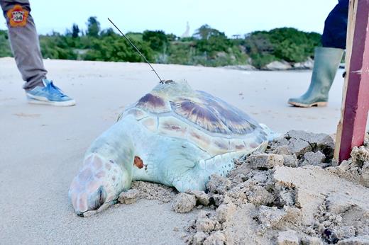 金門縣政府接獲民眾通報料羅灣海灘發現死亡海龜,現勘為保育類野生動物綠蠵龜(見圖),經轉寄國立海洋大學進行解剖,死亡原因應為魚網纏繞導致死亡,另消化器官亦發現塑膠垃圾;由於無法確認死亡確切地點,縣府除呼籲漁民若有誤捕海龜等保育類動物,請通報縣府處理外,更應減少使用塑膠製品,避免海洋汙染。 縣府建設處表示,本案經料羅鄉親於六月廿七日通報後,除立即冰存屍體外,即利用農委會林務局海龜通報群組,改由國立海洋大學程一駿老師實驗室接手並協助解剖釐清死因。 另,海大發現背甲直線長為44公分,背甲直線寬為35.6公分,體重為11.88公斤,性別為公龜,推測約5~10歲。海龜的右前肢有一枚鈦合金數字標,標號為098,其上標單位為廈門大學劉敏教授其研究團隊所標記的,由相關新聞報導可知這隻海龜應該是在2014下半年度所誤補並收容,約留置二年並於六月廿三日上午於廈門外海野放。 建設處表示,海龜的左前肢基部有傷口,且在頸部有疑似漁網纏繞的痕跡。海龜體內與臟器周圍富含豐富的脂肪,可見海龜在收容時有攝取足夠的營養,但海龜的食道、小腸與大腸內皆無任何食物存在,而在胃與十二指腸的部分有明顯的異物阻塞,將阻塞物取出後發現為一條長約15公分塑膠軟管以及尼龍繩漁網,因此推論海龜的死因可能是受到魚網纏繞而死亡。 建設處說,海龜在收容過程中有收到良好的照顧,甚至有些肥胖,但在收容後期推測有誤食塑膠軟管及尼龍繩導致消化道阻塞,且因消化道阻塞所以導致綠蠵龜有一段時間未進食,因此在小腸及大腸的部分才未發現食物或是糞便。 建設處說明,在過往的訪談歷史中,在塔山等處海岸曾有海龜上岸產卵紀錄,但隨環境改變,金門地區已多年無海龜通報案例,103年則在北山海岸有民眾發現腐爛海龜遺體,惟因腐化嚴重無法確認種類;綠蠵龜目前為保育類野生動物,以海藻等植物為主食,綠色素的累積導致其脂肪呈綠色,故被稱作綠蠵龜。 綠蠵龜已瀕臨絕種,全世界僅剩下約20萬頭產卵母龜,為瀕臨絕種的保育類野生動物。在人為干擾方面,產卵棲地的破壞包括騷擾產卵母龜、不當挖掘龜卵、捕捉小海龜及不當的建設開發、挖取沙灘沙石移作他用、岸上燈光設置;在海洋棲地的人為危害主要是不當漁法所造成海龜混獲問題嚴重,其次是非法的漁撈如炸魚及毒魚,還有海洋的污染而使牠感染治癒機會極低的纖維狀乳凸瘤。在澎湖的望安島已於1995年已經設立了產卵棲地保護區,後來還設立了綠蠵龜觀光保育中心,進行保育與教育工作。