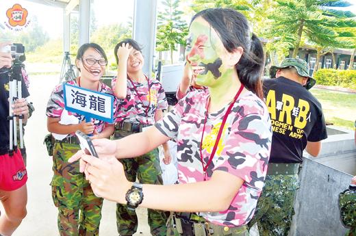 圖文/陳冠霖 第3梯金門暑期戰鬥營18日至22日展開,昨(19)日進行第2天課程,安排學員至兩棲營區「體驗偽裝」,軍方人員幫金戰營學員塗上又濃又厚的偽裝膏,有綠色、咖啡色和黑色,一名女生學員自告奮勇示範,願意「被塗全臉」,原本清秀的她,閉著眼睛讓教官幫她塗滿整臉偽裝膏,完成後,女學員拿出手機自拍看看「成果」,一看到自己臉上「全綠」加上咖啡色和黑色的花紋,女學員當場哈哈大笑。不過她說畫成這樣很可愛,是種不同的體驗。