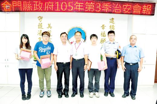 金門縣政府105年第三季治安會報昨日舉行,由副縣長吳成典主持;為落實暑假期間保護青少年安全,並營造優質成長環境,提倡正當休閒活動,並確保本縣學子安全活動空間,縣警局提案建請暑期保護青少年-青春專案聯合稽查案,縣府由警察局統合各單位共同編組成立「聯合稽查小組」,針對青少年深夜經常流連之網咖店、電玩店、撞球場等影響身心健康發展場所,加強稽查取締,並對違反各項行政法令之業者、場所施以處罰,以有效維護青少年出入場所之安全。 於昨天的治安會報中,吳成典首先頒發感謝狀給楊靜茹、張智凱、辛益豪、辛益昌等四人,表彰他們機警通報警方和成功攔阻民眾險遭詐騙案。吳成典說看了他們積極勸阻民眾遭騙,十分的感動,並建議除了感謝狀外,也應酌予頒發獎金,以資獎勵,將擇期請他們四人,表彰對防詐騙和治安的貢獻。同時,吳成典也希望在暑期期間加強預防犯罪和防溺及宣導工作,度過一個平安的夏天,讓社會更祥和幸福。 教育處副處長陳金文報告上次會議指示事項情形,指在拒學中輟及偏差行為的兩項均呈現下降之趨勢,顯見學校輔導工作有其成效。惟近年來地區社會環境及家庭結構丕變,學生重大偏差行為及身心適應問題仍層出不窮,學校輔導工作亦日益吃重,未來教育處仍將從行政面及專業面持續督導及協助學校完善高關懷學生輔導工作,以減少未來可能造成的社會治安問題。 縣警局對本期治安狀況綜合分析,於全般刑案以公共危險、詐欺及毒品案件所佔比例較高,比較兩期全般刑案發生案類,以公共危險(增加十五件)、毒品(增加十三件)、妨害名譽(增加十一件)及詐欺(減少十三件)為主要差異;至於有關分析及檢討策進作為如下: 一、公共危險:本期公共危險案件發生四十八件,較去年同期增加十五件,且其中四十三件為酒後駕車案件,查本期酒後駕車致生交通事故案件計十七件,自警局針對易肇事路段規劃防制作為及加強取締後,酒後駕車致生交通事故案件大幅減少(四月至六月酒後駕車致發生事故件數依序為十件、三件、四件),警局將持續規劃路檢勤務及辦理宣導作為,採「取締」、「宣導」併進方式,強化民眾交通安全觀念。 二、詐欺:本期受理詐欺案件仍以新興詐欺手法(網路購物)為主,被害人主要為學生,且每有新型詐欺模式出現,即成為被害高峰,在警局積極宣導下,地區民眾被害情形較去年同期略有減少,警局將賡續與金門及銘傳大學保持聯繫,結合地區活動辦理宣導,並將新型詐欺模式作為重點宣導課題(如多益詐欺等),以防止民眾受害。 三、毒品:自六月起警局啟動「全面加強緝毒專案工作」第一階段掃蕩作為,針對轄內可能涉及毒品犯罪之處所加強臨檢,並擴大追查毒品來源,同時為避免暑假期間成為毒品犯罪高峰,警局發動綿密掃蕩專案及臨檢作為,為本期毒品案件增加原因。 另,財政處報告菸酒管理工作在執行私劣菸酒稽查取締成效外,以及辦理菸酒管理法令宣導活動、輔導地區酒品產業發展,並呼籲鄉親勿運輸、販售免稅菸酒品、提醒民眾知法守法避免違法受罰及勇於檢舉不法菸酒品。 消防局在防溺勤務專案報告指出,本縣四面環海,防溺工作為重要施政重點工作,尤其目前極力推動海上觀光發展之際,若沒有完善安全規劃,勢必影響旅遊發展,亟待各單位共同合作,針對災害防救三階段「整備」、「應變」與「復原」投入所需資源,由單位間各司其職,共同編織水域防護安全網,以有效降低溺水案件發生率。