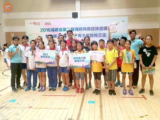 由福建省體育局、廈門市體育局、福建省跳繩協會聯合舉辦的2016福建海峽兩岸跳繩邀請賽在廈門舉行,金門湖埔國小也受邀參與體育交流,與來自臺灣、香港、福建等三地10支隊伍參賽的情形下,榮獲團體總成績第五名等多項佳績,湖埔國小楊肅藝校長希望湖埔跳繩隊能越跳越好,躍上國際舞台為地區爭光。 湖埔國小楊肅藝校長指出,湖埔國小跳繩隊成軍至今已五年,在劉文雄、黃孟元兩位教練的長期訓練下,表現越來越突出,今年再度獲邀參加福建省海峽兩岸跳繩邀請賽,成績亮眼,在個人項目方面,六年級盧易榮獲少兒女子組30秒一迴旋第一名、三年級楊喬昕榮獲兒童女子組30秒一迴旋及3分鐘一迴旋第八名、五年級楊傑仁榮獲少兒男子組30秒交叉一迴旋第五名、五年級楊邵桓榮獲少兒男子組30秒一迴旋第七名及30秒二迴旋第八名、三年級楊軒綾榮獲兒童女子組30秒二迴旋第五名;在團體項目上,楊軒綾、楊喬昕參加兒童組兩人車輪花樣賽,榮獲第三名,楊子葳、楊軒綾、盧易、楊郁蓁參加4人45秒交互繩一迴旋接力賽,榮獲第三名。