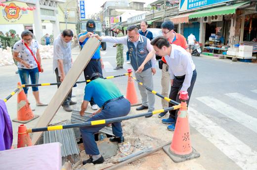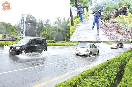 圖文/楊水詠 由強轉中,再轉為低度颱風,尼伯特颱風對金門島構成威脅,雖然風勢不大,但卻帶來豐沛雨量,平均約一百四十公厘左右。因颱風天的大雨,造成金城、金湖、金沙地區的多處路段,因為渲洩不及造成積水,最高約有好幾十公分,車輛涉水而過,捲起一陣水花,險象環生的景象。 在颱風期間,縣府各單位動起來!工務處處長張忠民(見右上圖)陪著縣長陳福海巡視防洪工程外,昨日上午八時四十分左右,他更帶著工務處人員冒著颱風天,身穿藍色雨衣到處巡視道路有無積水,更在白玉樓路段積水路段,拿著斷木清除淤積,讓路面積水能夠排掉,以維護往來人車的安全,民眾看到了都會有感!
