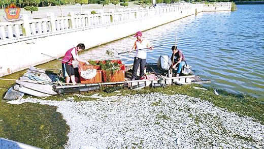炎炎夏日來到,加上多日持續高溫天氣;由於水中氧氣不足,又遇上大熱天;昨(三)日傳出莒光湖魚群暴斃,縣長陳福海在「親民日」時有民眾反映,陳縣長馬上要求養工所立即處理,動員人力和竹筏打撈,由於暴斃魚群數量過大,養工所希望能在今天全部清除完畢,恢復莒光湖潔淨的景觀風貌。 位於金城轄區內莒光湖,緊臨石雕公園、金門天后宮與莒光樓,是民眾休憩也是觀光景點。在昨天上午傳出莒光湖內魚群大量暴斃,漂浮在水面上;而且,加上這幾天天氣高溫,已傳出臭味,對於景點環境不無造成影響。 昨天是「縣長親民日.鄉親逗陣來開講」首次在東門代天府舉辦,陳縣長率縣府各局處主官管到場與鄉親近距面對面開講,探求民瘼和基層心聲建議;在親民日上,陳縣長接受反映在早晨運動時分,莒光湖湖面及靠近行人道湖畔出現魚群暴斃,並傳出死魚的陣陣臭味,聞了使人欲作嘔的情形! 陳縣長了解之後,馬上要求養工所立即動員處理;昨天雖是星期假日,大熱天氣;養工所所長許績鑫於十時許抵達莒光湖現場勘察,發現初期為小魚群暴斃,但隨著氣溫升高,較大型的魚群逐漸浮出水面的狀況。 經養工所請教金門水試所魚群暴斃原因,主因為連日高溫,且水中含氧度不足,加上水中藻類繁生所致,才會導致莒光湖裡魚群暴斃的情事。 養工所第一時間已由值班班長先處理暴斃的魚群,並馬上請委外廠商進行打撈;昨天出動十餘位人力及竹筏清除工具,在大熱天下全面展開清除工作,陳縣長重視民意和養工所的動員能力,得到在莒光湖畔的金城鎮老人協會表示肯定與體諒辛勤! 莒光湖魚群暴斃初步判斷可能是天氣太熱,湖水缺氧;而且由於暴斃魚群數量和面積過多,養工所所長許績鑫表示今天將再投入清除工作,希望能在今天全部打撈完畢,恢復莒光湖景點環境潔淨風情外,許績鑫也請教參議翁自保認為屬自然現象,將透過海水潮汐來調節莒光湖湖水,增加湖水含氧和水質,減少魚群再發生暴斃的情事。