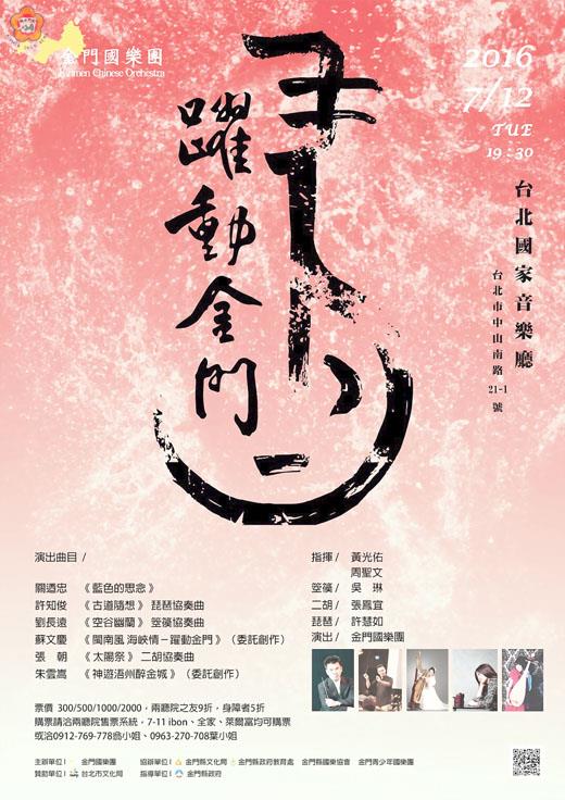 金門國樂團繼2015前進北京國家大劇院後,將於7月12日再度登臨台北國家音樂廳演出【躍動金門】,金門國樂團這次的演出,全團人員均為金門子弟獨立演出。相信此次演出必定能再為金門完成一次成功的藝術文化形象展現。此次在國家音樂廳表演,為售票演出,除了透過音樂廳售票系統的售票,金門國樂團更希望各單位能發揮影響力,協助推票工作,並希望旅台鄉親、團體、朋友、個人踴躍購票前往聆聽,除了可以聆聽來自家鄉優秀子弟的精湛演出,也增加大家對金門音樂藝術文化深耕之認識。國樂團表示,若鄉親有意購票前往聆聽,可與金門國樂團翁小姐聯繫,聯繫電話為 0912769778。 金門國樂團表示,7月12日晚間,台北國家音樂廳「躍動金門」音樂會,的演出,是由金門國樂團主辦,金門縣政府教育處、金門縣文化局、金門國樂協會、台北簪櫻國樂團、金門青少年國樂團協辦,這場每年國家音樂廳的音樂會,也希望藉由音樂會,凝聚鄉情,讓久居台灣地區的金門鄉親,感受濃濃的鄉情及這些年來,金門在文化發展的實力。 金門國樂團自2006年成團以來,多次赴台北國家音樂廳、台北市中正堂及台中中興堂等大型音樂廳展演,2015年更前進北京國家大劇院演出。十多年來,這個由金門的各級學生國樂團、加上畢業的學生所組合的樂團,漸漸成熟轉型,不斷培養豐富的舞台經驗,成為一支專業演出的樂團,廣受樂界高度的肯定。 近年來,金門國樂團除了演繹兩岸多位名家經典的曲目,為深化金門國樂發展潛力,2009年特委託名作曲家蘇文慶老師創作「風獅爺傳奇」、2012年邀請盧亮輝老師譜寫「愛戀金城」、2015年委請蘇文慶老師譜寫「閩南風 海峽情-躍動金門」,今年更委請朱雲嵩老師創作「神遊浯洲醉金城」也將在此次的演出首演。金門國樂團也期許藉由金門的國樂組曲,成為兩岸樂團的演奏曲目,透過樂曲了解認識金門,也用音樂成為宣傳文化金門的願望。