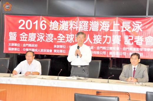 2016搶灘料羅灣海上長泳暨金廈泳渡~全球華人接力賽金門記者會昨天舉行,由縣府秘書長林德恭主持;搶灘料羅灣將於七月三十日率先登場,也為七月三十一日下水的金廈泳渡暖身,並期望更多熱愛海泳人士共襄盛舉,達到「一人參加,全家來」促進觀光休閒活動效益目標。 這場金門記者會於昨日上午十時,假縣府新聞發佈室舉行,縣府教育處副處長陳金文引言表示,搶灘料羅灣海上長泳今年進入第十四屆、金廈泳渡第八屆,並已於六月十七日假台北舉辦一場新聞發佈會,而金門新聞發佈會昨(四)日舉行,旨在希望有更多熱愛海泳人士參加。 縣府秘書長林德恭表示,搶灘料羅灣及金廈泳渡是金門每一年度的盛大海上體育活動,分別邁入第十四個年頭和第八個年頭的歲月,並說這兩項海泳活動歷久彌新,越辦越受到社會各界的肯定和喜愛,也是各相關單位共同努力的成果。 林德恭說,金廈泳渡暨搶灘料羅灣海上長泳預定於今年七月三十日及三十一日舉辦,希望新聞媒體廣為宣傳,廣為人知,共襄盛會;同時,他說金廈泳渡更讓兩岸邁向和平、也讓兩岸人民透過和平友誼的交流,以及促進兩岸友好。 林德恭指出,搶灘料羅灣及金廈泳渡已蔚為海上體育休閒活動風氣,網羅兩岸四地(台灣、大陸、香港、澳門)最優秀長泳好手參加,活動越辦越大,並有企業贊助讓愛泳人士有著賓至如歸之感。另,復興航空配合海泳提供優惠活動,有助活動更能發揮創意和期待。 林德恭說,相信今年的搶灘料羅灣及金廈泳渡舉辦得更熱絡和更盛大,也更深受熱愛海泳人士歡迎;至於金廈泳渡每雙年由金門泳向廈門,提供全額獎金三十萬人民幣,讓選手來競爭和獎勵,並且成績越來越好! 此外,林德恭也希望主辦單位和贊助單位再接再厲,全力以赴,把搶灘料羅灣及金廈泳渡辦得更有聲有色,有更多的人支持關注和熱愛、成功! 金酒總經理車正國表示,金門是一個海島,搶灘料羅灣及金廈泳渡X,金酒是最標準者的贊助者;而如金酒籃球隊、中小學棒球隊和體育競賽活動,盡心盡力來贊助,希望透過贊助讓全民更健康、更陽光!車正國也希望金酒得到國際獎項及高額獎金,來帶動海泳的熱潮,如英吉利海峽泳渡,有朝一日也有台灣海峽泳渡,並強調只要是體育活動,金酒都能來贊助,讓活動辦得更好。 金廈泳渡競賽活動自2009年開辦至今已辦理七屆,今年為第八屆,雙數年由金門游向廈門,單數年由廈門游向金門,距離約七公里,參賽人數為一百隊二百人(二人接力),角逐總獎金人民幣三十萬元。今年是由烈嶼鄉雙口海岸下水後,游向廈門椰風寨海灘,為保障選手安全兩岸各單位如醫護、海巡、消防、海上救生於海上皆出動約一對一的安全防護。 承辦單位表示,2015年最佳成績為大陸選手翁境煒與韓爍以一小時三十六分取得冠軍;今年金門籌備會已於六月中選拔出台灣八十位最佳選手加上港、澳及大陸計二百位(鵡組)兩岸四地泳將的海上接力長泳競賽,林德恭期望能突破去年最佳成績。 今年已進入第十四屆的搶灘料羅灣海上長泳,一直是國內外游泳愛好者們口耳相傳的經典賽事,游泳距離為三千公尺假料羅灣舉行,在一千五百公尺時折返,周邊有救生艇與救生員戒護,是夏天最棒的戶外運動之一。承辦單位表示因金門縣政府規劃與宣傳得宜,且有前面十三年的基礎,在各界喜愛海泳選手支持下,截至六月二十日止已有超過二千人報名,共襄盛會活動。 承辦單位指出,早先在軍管時期,金門海域的休閒活動都是受到限制的,直到軍事管制解除後,海邊活動才開放,也因此選手們才能在金門乾淨、自然的海域沙灘活動,也才能在曾經炮火連連的料羅灣體驗長泳的樂趣更是眾所期待。 2016廈金泳渡暨搶灘料羅灣海上長泳是由金門縣政府與廈門市政府共同主辦;搶灘料羅灣活動更邀請到金門酒廠實業股份有限公司、維他露食品股份有限公司、復興航空公司贊助辦理,大會藉由舉辦多年的經驗,一定能讓共襄盛舉的長泳好手們對金門留下善良、熱情、好客的美好精神,歡迎您一同來參與!