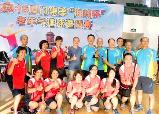金門縣中華氣排球發展協會,六月下旬赴廈門市集美區參加2016「海峽杯」老年人氣排球邀請賽,兩岸三地氣排球同好齊聚一堂切磋交流,昨(5)日起一連兩天下午,廈門市氣排球老年人體育會彭仁杰抵金指導基本動作練習,歡迎有興趣民眾前往參與。 2016「海峽杯」老年人氣排球邀請賽,由廈門市集美區老年人體育會承辦,金門縣中華氣排球發展協會受邀下也組隊前往參與,此次包括福建省廈門、晉江、泉州、江西、北京、深圳、新加坡、香港、臺北市等各路好手,總計有十餘隊齊聚一堂切磋球技,以球會友。 金門縣中華氣排球發展協會表示,協會剛成立一週年,六月由總幹事張序伯率同氣排球男、女生兩隊20位選手,跨海至廈門市集美區參加2016「海峽杯」老年人氣排球邀請賽。為了提升實力也特別於比賽前乙個月每天在縣立體育館加緊練習,希望能爭取好成績,而比賽前一天專程到羅源縣拜會取經並做賽前練習。 值得一提的事,男生隊組成員為地區各球類好手,包括,張峰啟、陳國民、張序伯、楊榮豐、周建南、許榮緒等六員,每場比賽愈挫愈勇比數愈拉愈近,讓其他隊伍刮目相看,最後獲得優勝獎。而與會成員也十分感謝主辦單位招待住宿暨膳食等各項生活設施,讓所有夥伴們盡情享受比賽。 金門縣中華氣排球發展協會總幹事張序伯表示,是項運動適合各階層年齡,昨日及今日兩天下午14:30-17:30時,廈門市氣排球老年人體育會彭仁杰老師特別跨海抵金,假金門縣立體育館指導基本動作練習,歡迎地區各校體育老師、各鄉鎮樂齡中心承辦人、地區各項球類好手和有興趣民眾,直接前往縣立體育館取經,活絡筋骨也參與氣排球運動。