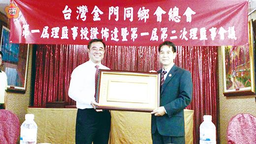 台灣金門同鄉會總會第一屆理監事授證佈達暨第一屆第二次理監事會議,昨日在南台灣的高雄舉行,金門縣副縣長吳成典偕縣府社會處處長甯國平出席盛會;吳成典代表縣長陳福海贈送賀匾致賀外,並祝會務蒸蒸日上,全體旅台鄉親安康、事業成功。 這項授證佈達暨理監事會議於昨日上午十時三十分舉行,吳成典偕社會處長甯國平兼程搭機赴高雄市參加,受到總會長李台山和各理監事鄉親的歡迎,吳成典也聽取與會鄉親建言,希望旅台鄉親和金門在地鄉親一起攜手,增進家鄉發展和繁榮。 另,吳成典認同總會長李台山對於家鄉充滿關懷之情,並表示旅台鄉親對於家鄉各項建設的關心,以實際行動表達對家鄉的熱愛,令人感佩,並說如果沒有各位的無私付出,我們會擔心日子一久,家鄉變故鄉,故鄉變他鄉;關心家鄉回到家鄉,會讓我們的家鄉更美好! 在會議議程中,總會長李台山頒當選證書給理監事,並在他主持下,除報告總會會務工作和財務狀況之外,並討論審議通過多項書面提案,均是跟旅台鄉親權益有切身關係,包括有: 一、爭取台金機票降價案,說明指出油價下跌航空公司並沒有反應在票價上適度調降,應匯聚鄉親力量向航空公司爭取鄉親權益。 二、2016兩岸金門籍青年夏令營!東台灣采風活力行活動計畫案,今年依決議再度由台灣主辦,秘書處規劃活動,預定今夏七月二十一日至二十五日假花蓮舉辦,並轉發大陸、金門、台灣各地聯絡窗口進行報名作業。而,其夏令營旨在通過兩岸實質文化、情感交流,為兩岸金門籍青少年搭建溝通交流平台,提高兩岸三地青少年教育文化認知,增進對母縣風土人文之了解、開拓人際關係,增進青少年情感。 三、積極推動不在籍投票離島先行試辦案,說明指出實踐不在籍投票,除了保障天賦人權與公民權利之外,還有很多好處。其中就是節能減碳,讓投票人在工作地投票,就不需要舟車勞頓,返鄉投票,造成海陸空交通堵塞、二氧化碳升高,也能提高投票率,增加代表性。 另提案建請金門縣政府興建金門戰役受難同胞紀念館案,說明指出金門縣自民國三十八年以來,歷經古寧頭戰役、八二三砲戰等重大戰役,確保逾六十年來之台海安全,促進台灣本島進步繁榮,對國家安全、社會安定、人民安康立了汗馬功勞,為兩岸和平奠定堅實的基礎。 提案也說明對於在金門屢次戰役犧牲的將士,全體鄉親由衷地敬佩與感激,惟金門全體鄉親在每一次戰役中,首當其衝,無戰不與,犧牲性命在所不惜。如何表揚金門同胞這種為國家犧牲的精神,茲建議興建紀念館,一方面可告慰受難同胞之英靈,同時亦可展現金門人的驕傲。此外,在當下追求私利的現實社會,若能將金門精神編入課綱,以發揚犧牲小我完成大我的金門精神,深信對下一代的人格教育有莫大的助益。 台灣金門同鄉會總會是旅台二十幾個旅台的金門同鄉會、宗親會,並經過一年多協調整合,始在今年三月底在台北市三軍軍官俱樂部成立,創會總會長李台山孚眾望當選,將率全台各同鄉會致力推動會務和為鄉親服務,協助金門縣政府推動各項政務,以及關懷故鄉鄉親事務、辦理與金門有關之社會公益、公共事務等活動。 另,台灣金門同鄉會總會主要任務有統合辦理旅台各地區金門同鄉社團之聯繫、服務及相關活動事宜;統合辦理海外金門同鄉社團來台接待事項;統合辦理各旅台金門同鄉社團共同事務;協助金門縣政府推動各項政務;關懷故鄉鄉親事務,增進鄉親交流活動,聯絡鄉親情感,謀求福祉,以及其他事項和服務工作。 此外,台灣金門同鄉會總會未來金門同鄉會總會將集結現有旅台各金門同鄉會社的力量,並扮演推動公益及參與公共事務角色,也將代表旅台共三、四十萬名金門鄉親,在政府研訂有關金門政策時,集結金門人的力量,向中央政府、立法院等機關發聲,適時遊說與督促或向民意代表施壓,爭取有益金門的建設或政策擬訂,讓金門人的聲音與意見,傳達台灣社會。