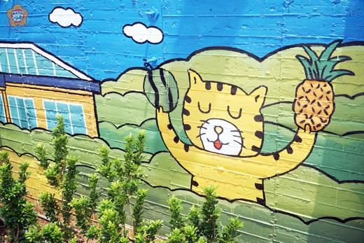 在地區相當著名的水果餐,在餐廳前方的一大片停車場,四周牆壁近日增添了不少五彩繽紛的色彩,原來是餐廳的主人翁世白邀請在地的藝術青年│呂士昂,協助創作十餘公尺長的大型壁畫;透過呂士昂將其筆下創作出的虎斑貓│「卡努」,將之勾勒繪於壁畫當中,可愛的卡努手上,拿著西瓜、鳳梨等等的水果,正好十分符合餐廳的餐飲主題。 而對於「卡努」這一個角色,許多人對牠第一眼的印象可能是,牠是一隻老虎吧?但其實牠是一隻虎斑貓,不過也或許是因為這個特別之處,反而讓人有著深刻的印象。國中開始就喜歡畫圖,呂士昂說,但進入大學之後反倒比較少拿畫筆創作,而「卡努」則是由創作者呂士昂,在他高中一年級時所發想構思出來的虛擬動物,至於名字則是自己在電子布告欄「批踢踢」上的代號。此外,呂士昂更是以「卡努是我的化身」,來為這隻由他賦予生命力的動物角色下註解。 在為水果餐餐廳繪製大型壁畫之前,他就已經有將「卡努」結合了金門多處著名的的名勝景點,畫了一套共有七張的系列明信片,藉著卡努來帶著民眾認識金門的縣鳥戴勝、瓊林村落以及下湖村落內的風獅爺、著名的金門之熊戰車,以及許多來到金門必定前往一遊的景點│古崗湖、文臺寶塔以及慈堤落日等金門著名美景。而在不久之前,卡努也悄悄地登上了大家所熟悉的Line通訊軟體的貼圖,供民眾購買下載。 與卡努創作者的緣分,餐廳負責人翁世白表示,他是在山后民俗文化村內的販賣店裡面,看到了呂士昂所創作的卡努明信片,當下看了非常的喜歡,同時也覺得呂士昂很有繪畫的天份。恰巧當時明信片作者呂士昂也正好在民俗文化村內,因此他就當場邀請呂士昂到他自家位於伯玉路上的餐廳,幫忙進行停車場的圍牆牆面創作,呂士昂也欣然接受。 翁世白同時也認為,呂士昂的創作作品,筆觸十分生動而且活潑。不僅如此,他也覺得卡努的造型是十分的可愛,與餐廳所想要營造出的明亮色彩,彼此之間呈現出一種非常調和的感覺,因此他也相信,呂士昂在餐廳停車場牆壁所繪製的卡努壁畫對於他的餐廳而言,是會有相當程度的加分作用的。 大型壁畫的彩繪的工作,是從四月中旬左右開始進行的,並且在五月中下旬左右順利完工,呂士昂指出,這是他第一次獨立創作完成長達四十公尺的巨型作品,所以對他而言,可說是一項相當大的挑戰。不過也因為擁有這麼大的揮灑空間,也讓他的景點創作,比起明信片要多出了「漢影雲根」和「毋忘在莒」兩個景點;同時,他也感謝餐廳老闆翁世白,提供了一個特別的場域,讓他盡情的揮灑創意。