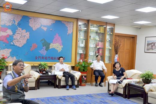 抵金參與金門鱟保育研討會的清華大學分生所所長張大慈一行,昨日拜會縣長陳福海,就鱟的生態與保護策略及鱟的生技應用等議題,和陳福海縣長交換意見。陳福海說,對於鱟的保育,歷任縣長都很用心在做,這也是一項長期和必需持續的工作,雖然容有不足,但用生命守護這個島嶼是他一生的志業,未來,他一定會加大力度,與清大這個有「品牌」的團隊合作,讓金門鱟的保育與土地共生,同時一起為打造更友善的生態島嶼共同努力。 這場拜會行程於昨日上午九時起在縣長室進行,清大團隊除張大慈所長,還包括縣府顧問清大生資所教授曾晴賢、清大總務長生資所教授呂平江、清大生科院副院長生技所教授楊嘉鈴、清大分生所教授藍忠昱、清大分生所副教授王慧菁、清大分生所助理教授黃貞祥、清大生資所副教授蘇士哲、嘉義大學生物資源學系暨研究所博士後研究人員楊明哲及環球生技雜誌總編輯林明定等人。縣府出席人員則有縣長辦公室主任陳永明、參議翁自保、建設處長許志忠、副處長王垣坤、水試所所長楊文璽、科長鐘立偉及樊德政。 張大慈所長代表清大團隊致詞表示,此次團隊結合科技、人文及保育專家抵金開研討會,除了高度顯示團隊對金門鱟生態保育的重視,也希望藉由產學聯盟,縱深與水試所乃至金酒合作的面向,如酒糟面膜研發及酒糟高加值化的提升與利用等。 陳福海說,自己是佛教徒,從政以來也無不以「正心正念」來面對這個有情島嶼,而清大無疑正是個品牌,他會珍惜大家一起為鱟生態乃至水獺保育而結下的善緣,更尊重清大團隊所提供的專業意見,「生態島嶼、永續金門」為他的施政願景之一,此時此刻,在金門尋求翻轉的關鍵時刻,也希望清大團隊能多給一些專業的指導,大家一起來為島嶼的生態保育獻力。 值得一提的,藝術大師黃登貴昨也偕同畫家黃靖瑜拜會陳縣長,黃大師並以「鱟」文創品相贈,用行動傳達對金門鱟保育最有力的支持。