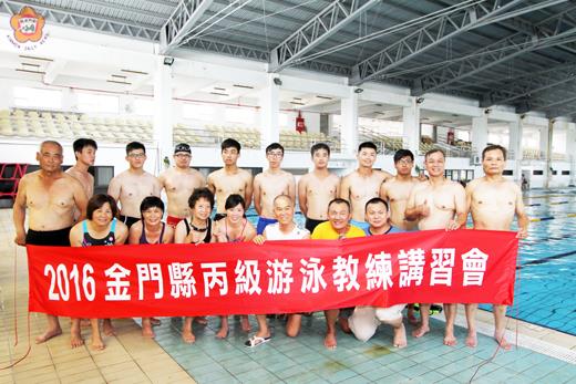 縣府辦理「2016金門縣丙級游泳教練講習會」,經過一連三天學科與術科訓練課程後,昨日結訓有二十一位學員順利通過考試,進一步提升游泳教練技術水準及游泳教學方法,以建立游泳教練制度及加化全民游泳自救能力。 這項丙級游泳教練講習會是由教育部體育署指導、金門縣政府、中華民國成人游泳協會主辦,金門縣立體育場承辦,金門體育會游泳運動委員會協辦,於26日至28日一連三天在縣立體育場和游泳池辦理。希望藉以發展全民游泳運動,提升游泳教練技術水準及介紹游泳教學方法,以建立游泳教練制度及強化全民游泳自救能力。 本次游泳教練講習包括地區中小學校老師等共二十二人報名參加,在姜茂勝(中華民國水上救生協會考試官兼教練召集人)、許金德 (台灣警察專科學校海巡科、消防科教官)、劉宜承(中華民國成人泳協專任教練、2010廣州亞運國家隊教練)三位教練細心指導下,進行包括:初學游泳教學演練。捷泳、仰泳、蝶泳、蛙泳的技術分析與訓練方法。自救法、踩水、水母漂、仰漂、韻律呼吸、抽筋處理。出發及轉身。綜合示範教學等訓練課程。 參與學員認真學習游泳教練技術及游泳教學方法,以充實游泳教練專業知識與技能。在經過三天的學科、術科練習並驗收訓練成果,共有二十一位學員通過測驗及格。