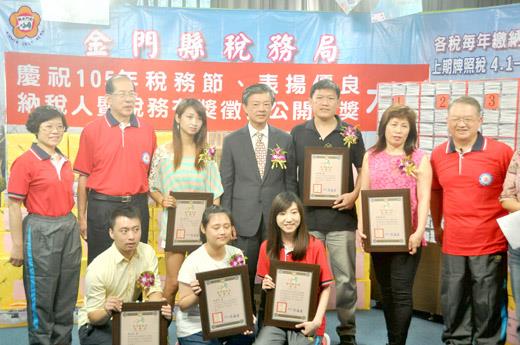 金門縣稅務局昨日在名城有線電視台舉行105年稅務節慶祝大會暨表揚優良納稅人﹐會中由縣府祕書長林德恭親自頒發薛承時等6名優良納稅人及績優稅務人員獎項﹐林德恭勉勵同仁慶祝稅務節要以服務代替慶祝﹐堅守稅務工作崗位﹐繼續強化服務效能﹐為納稅人提供更便捷﹑舒適的徵納環境。 稅務局辦理一○五年稅務節慶祝大會於昨日上午十時在名城有線電視台舉行﹐由縣府祕書長林德恭頒獎表揚六位優良納稅人﹐分別是土地增值稅薛承時﹑謝永鴻﹐地價稅林榮泉﹑許炳賜﹐房屋稅關閎中﹑顏美碧及績優稅務人員翁靖俞﹐表彰渠等對地區稅賦卓著貢獻。 稅務局長王漢文表示﹐政府自民國78年開始﹐將每年7月1日訂為稅務節﹐用以鼓舞從事稅務工作人員的士氣﹐並對稅務人員在健全財政﹐增裕稅收以支應國家各種施政需要的努力表示重視與肯定﹐今年因為配合公務行程﹐特別提前於昨(24)日舉行頒獎活動。 這項稅務節慶祝大會於昨日上午十時在名城有線電視台舉行﹐由縣府祕書長林德恭主持並頒獎表揚六位優良納稅人﹐首先代表陳縣長致詞祝賀稅務同仁佳節愉快﹐同時肯定工作的辛勞和奉獻﹐勉勵同仁慶祝稅務節要以服務代替慶祝﹐堅守稅務工作崗位﹐繼續強化服務效能﹐為納稅人提供更便捷﹑舒適的徵納環境﹐政府存在的目的﹐就是要協助民眾解決問題﹐希望藉由各項慶祝活動﹐讓民眾感受到稅務同仁「e流的效率﹑專業的服務」﹐並深植依法納稅的觀念﹐共同為家鄉建設與永續發展貢獻心力。 林德恭指出﹐政府依法向人民徵稅﹐人民自應依法繳稅﹐稅務局有義務與責任讓納稅人充分瞭解租稅減免相關規定﹐進而維護納稅義務人的權益﹐讓人民想繳稅﹐歡歡喜喜的繳稅﹐並且以繳稅為榮﹐稅捐的稽徵猶如拔鵝毛理論﹐拔了毛而鵝不叫﹐這是稽徵的最高境界﹐因此稅務局要繼續強化服務效能﹐提供更簡捷專業的服務品質來滿足鄉親需求﹔近年來稅務局主動出擊﹐積極推動的飛躍稅務通跨區域服務﹐就是一個便民服務的成功典範。 林德恭表示﹐租稅收入是支應政府施政的重要財源﹐依法納稅是人民應盡的義務﹐合法節稅是人民應享的權利﹐主動退稅是稽徵機關的責任﹐以財政支援建設﹐以建設培養財政是租稅的願景﹐讓鄉親輕鬆繳稅沒煩惱﹐租稅便民服務無遠弗屆是稅務局的核心價值與努力的方向。同時感謝鄉親對金門縣政的支持﹐更歡迎各界嘉賓蒞臨共襄盛舉﹐使大會更臻圓滿﹑成功。
