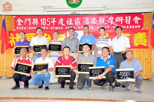 金門縣105年度忠孝新村社區治安研習觀摩活動,昨(25)日在金沙鎮忠孝新村社區活動中心進行一天的課程,縣長陳福海期勉本縣社區治安團隊,要深耕社區治安,建構優質的治安環境,並達到全民治安之功效,且特別指派副縣長吳成典代表頒獎表揚本縣推動社區治安工作績優社區及人員,感謝平時為社區治安所作的努力和付出。包括縣議會議員李應文、蔡水游等貴賓列席,另參加人員有縣政府社區治安團隊,社區守望相助隊成員等計150人參與。 副縣長吳成典代表陳縣長頒獎表揚本縣推動社區治安工作績優社區及人員,包括榮獲內政部103年社區治安績效評鑑績優社區一般組優等-東坑社區。榮獲內政部105年度標竿社區-忠孝新村社區。榮獲本縣104年推動社區治安工作專案競賽績優社區,第一名:忠孝新村社區、第二名:榮光社區、第三名:新頭社區、第四名:后盤山西山社區。榮獲本縣104年度推動社區治安工作績優人員:忠孝新村社區王石堆、榮光新村社區楊進成、上林社區陳心富、峰上社區黃清和、庵前社區許開山、后盤山西山社區王志慶、新頭社區王阿庚、山外社區陳詩翰、浯坑田墩社區鄭君綏、後豐港社區洪篤全、湖峰社區楊肅黨、湖下社區陳國民。 吳成典致詞時表示,感謝大家過去為社區治安的貢獻、感謝警察同仁的辛勞,他說,金門是個不錯的地方,但還有改善的空間,勉勵大家一起努力。吳成典說,社區守望相助隊常不畏寒冬或冒著風雨執行巡邏,守護社區,非常辛苦。因此,陳縣長特別關心大家並指示警察局已購發每個守望相助隊6件外套,另因應今年冬天協勤急需,並動支預備金76萬元,準備購發守望相助隊人員每人1件防寒衣(辦理採購中)。而106年度更爭取編列守望相助隊運作、服裝、夜點等經費預算,希能助益社區守望相助隊之順利有效運作。另外,有關維護社區福利、安全的相關施政措施,例如獨居老人供餐服務、關懷據點(社會處)、住宅火災警報器裝設(消防局)及擴充錄影監視系統等措施,各單位要本於「基層札根」及「讓民眾有感」的理念,持續積極推動。 昨日上午活動結合警政、消防、社政及忠孝新村社區等,推出多項課題及邀請警察局、消防局、環保局、衛生局、社會處進行業務宣導及展列消防AED、CPR各項救生、滅火裝備器材,使觀摩活動內容豐富與多元化。消防局金沙分隊在現場進行消防救災實作演練,培育防災的觀念與災害緊急應變能力。 實作演習後,由忠孝新村社區人員與縣政府社區治安輔導團隊帶領實施「社區環境檢測及導覽」簡介,本縣各社區、守望相助隊及警政、消防、社政等人員,前往忠孝新村社區進行治安環境踏勘。下午研習活動,邀請消防局分隊長陳效杰、文化局科長周祥敏、社會處科長莊彩鴦講授「社區防救知能及自救」、「談社區營造」及「兒童及少年保護」等課程,藉由研習課程相互學習觀摩,以深化社區組織自我防衛能力,建立自我解決治安問題能力。