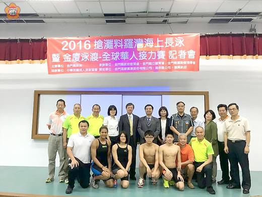 2016金廈泳渡暨搶灘料羅灣將於7月底登場,為炒熱活動熱度,這項兩岸唯一官方合辦的體育競賽活動,17日特別在台北召開第一場「行銷」記者會,由甫轉任金門縣府秘書長的林德恭、教育處長李文良及中華民國成人游泳協會總會長洪光濱共同宣布今年活動的相關訊息。 記者會指出,已然邁入第14屆的搶灘料羅灣海上長泳,將於7月30日率先登場,這項活動多年來一直是國內外游泳愛好者口耳相傳的經典賽事,游泳距離為3000公尺,在1500公尺時折返,周邊有救生艇與救生員戒護,是夏天最捧的戶外運動之一。而為了提供給泳士們最佳的環境及服務品質,限額2000名,即日起至6月20日,凡愛好游泳者,年滿10歲以上、75歲以下,身體健康並具長泳能力,均可以機關團體名義3人以上組隊報名,但為安全起見,不接受個人報名! 至於金廈泳渡則於7月31日早上鳴槍出發,適逢雙數年,今年路線由金門游向廈門椰風寨海灘,全程約7公里,預計參賽人數為100隊200人,總獎金達30萬人名幣(約150萬新台幣)。去年比賽最佳成績為來自中國的翁境煒、韓爍雙人組,他們以1小時36分取得冠軍。另大會於上周末也選拔出台灣80位最佳選手,其中男選手莊子賢、卓承齊,女選手墨俐兒、曾婕娟也出席了這場記者會。 目前就讀新北市林口高中二年級的卓承齊,2年前第一次參加金廈泳渡,當年這位國內男子1500公尺自由式紀錄保持人只獲得第5名,今年捲土重來,他自信說:「目標是第一!」 暑假後就要升上高三的卓承齊,也是備戰明年台北世大運公開水域項目,國內重點培訓的選手之一,他說,參與金廈泳渡算是暖身並提前為台北世大運做準備。 同樣是奧培選手的女將曾婕娟也在這次台灣選拔中脫穎而出,記者會當天她和今年全大運摘下公開女50公尺自由式、100公尺自由式雙料金牌的墨俐兒一同出席。 墨俐兒主項是短距離,參加金廈泳渡要和搭檔一起完成7公里,她笑說:「志在參加,第一次參賽就當經驗,不給自己壓力,先以完賽當目標。」